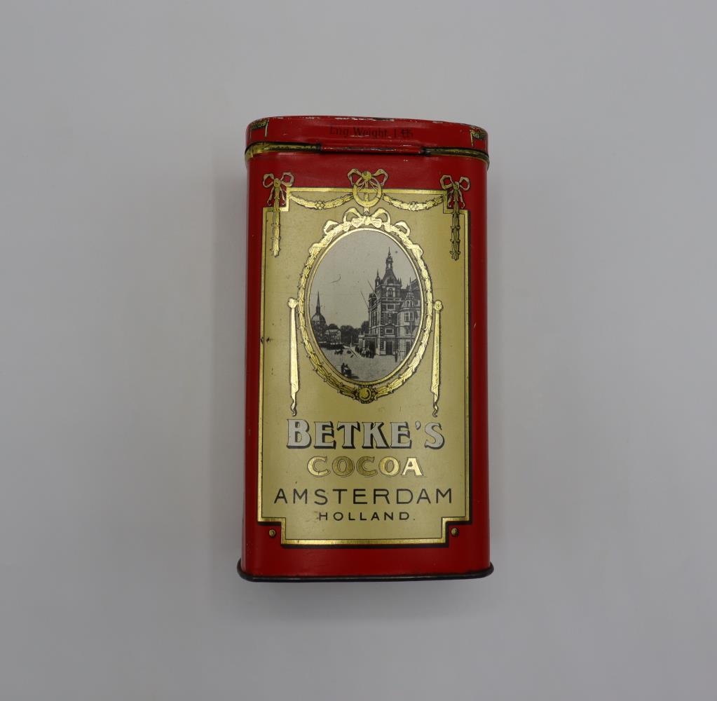 Ílangur, hár og rúnaður málmbaukur. Rauður litur í grunninn með kremlitaðri merkingu með gylltu skrauti, myndir af mismunandi byggingum í Amsterdam. Merking að framan "Cacao Bethe Maatschappij tot exploitatie van Bathel's Hollandsche cacaofabrick - Amsterdam Holland. Pakkað fyrir Magnús Kjaran Reykjavík".