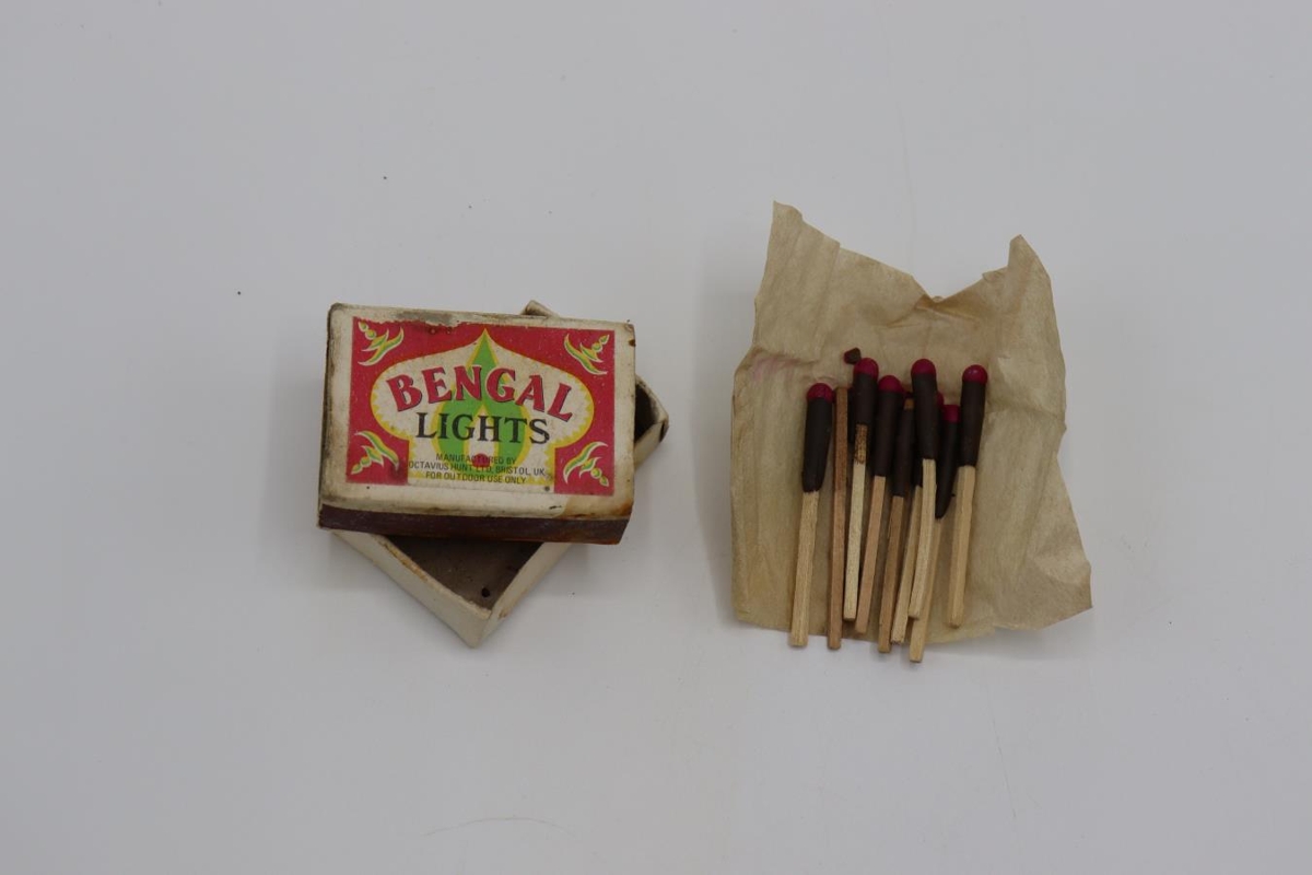 Rokeldspýtur í þar til gerðum eldspýtustokk. Rauður grunnur með indversku skrauti sem er grænt og gult á lit. Í miðjunni er dropi með gulum útlínum og grænn að innan. Inn í dropanum er annar minni dropi með gulum útlínum, hvítur að innan með rauðum punkt í botni. Merkt "Benghal lights", "Manufactured by Octavius Hunt ltd, Bristol, UK for outdoor use only".