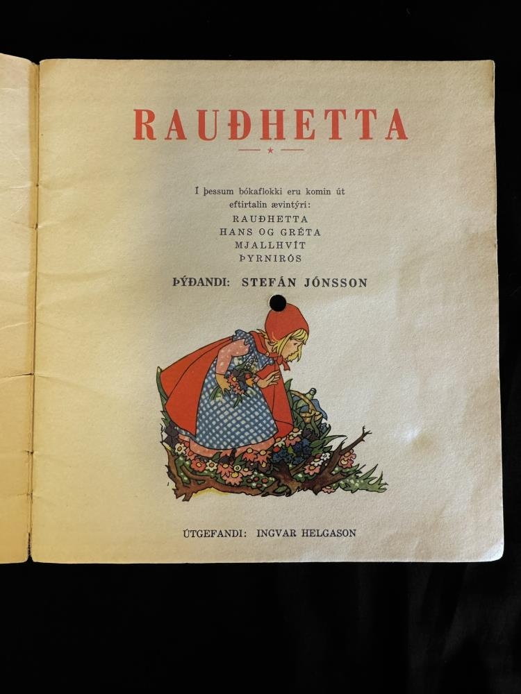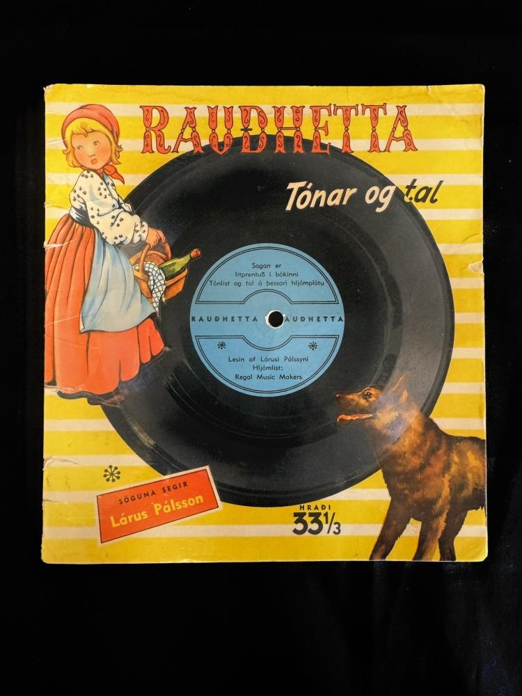 Bók og plata. Á forsíðu stendur : Rauðhetta - Tónar og tal. Sagan er litprentuð í bókinni. Tónlist og tal á þessari hljómplötu. Lesin af Lárusi Pálssyni. Hljómlist: Regal Music Makers. Hraði 33 1/3. Á forsíðu stendur: Rauðhetta. Í þessum bókaflokki eru komin út eftirtalin ævintýri: Rauðhetta. Hans og Gréta. Mjallhvít. Þyrnirós. Þýðandi: Stefán Jónsson. Útgefandi: Ingvar Helgason.