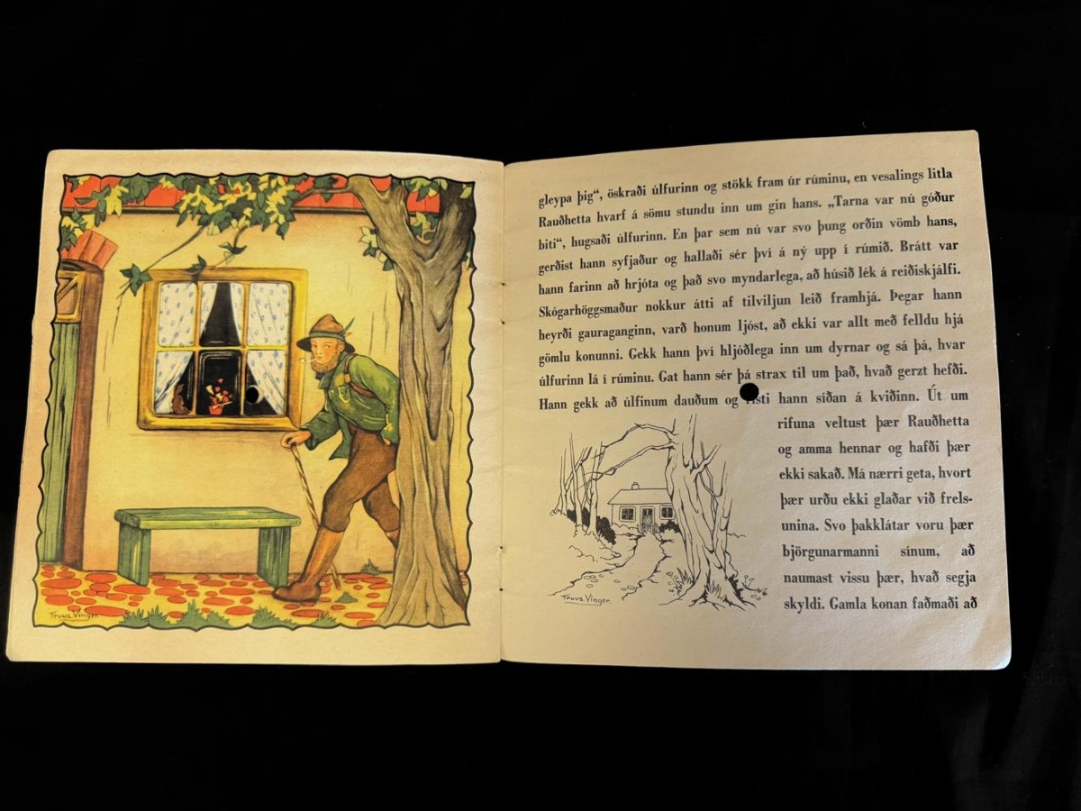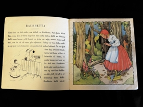 Bókin er gul með hvítum röndum, Mynd af Rauðhettu með körfu og úlfi. Myndirnar í bókinni eru bæði í lit og ólitaðar.