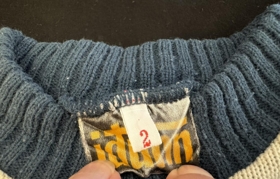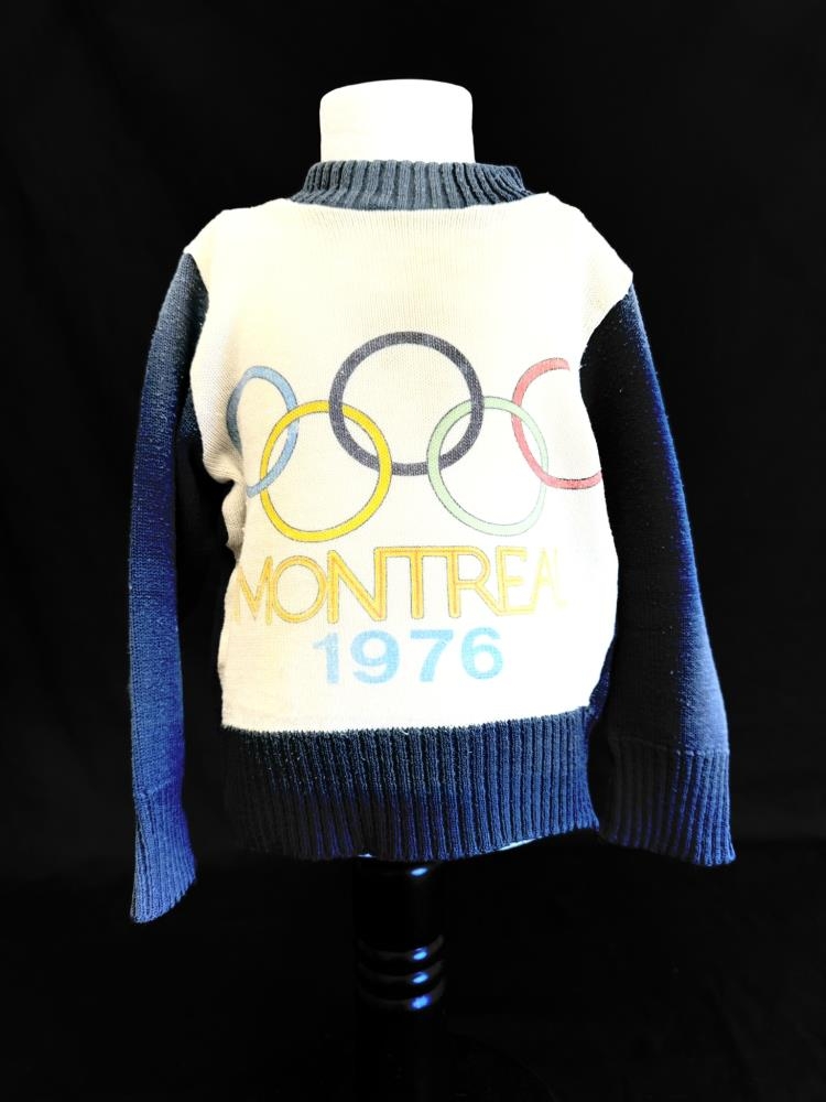 Lítil barnapeysa merkt ólympíuleikunum í Montreal 1976, gerð hjá Iðunn, Akureyri. Bræður Oddnýjar notuðu peysuna. Peysan er vélprjónuð, búkurinn er úr ljósu/hvítu garni og framan á henni eru hringirnir í ólympíumerkinu blár, gulur, svartur, grænn og rauður. Montreal, skrifað með gulu og ártalið 1976 með bláum lit. Stroff í hálsmáli og að neðan er úr bláu garni og sama bláa garn er í erumum.