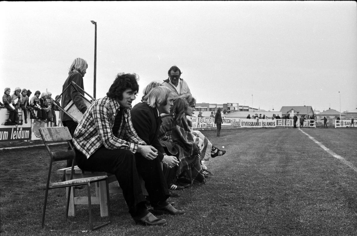 Knattspyrnulið Íþróttabandalags Keflavíkur tekur á móti Íslandsmeistarabikarnum 1973. Varamannabekkurinn, Grétar Mangússon fremstur, þá Joe Hooley, þjálfari. Sigurður Steindórsson stendur við enda bekkjarins.