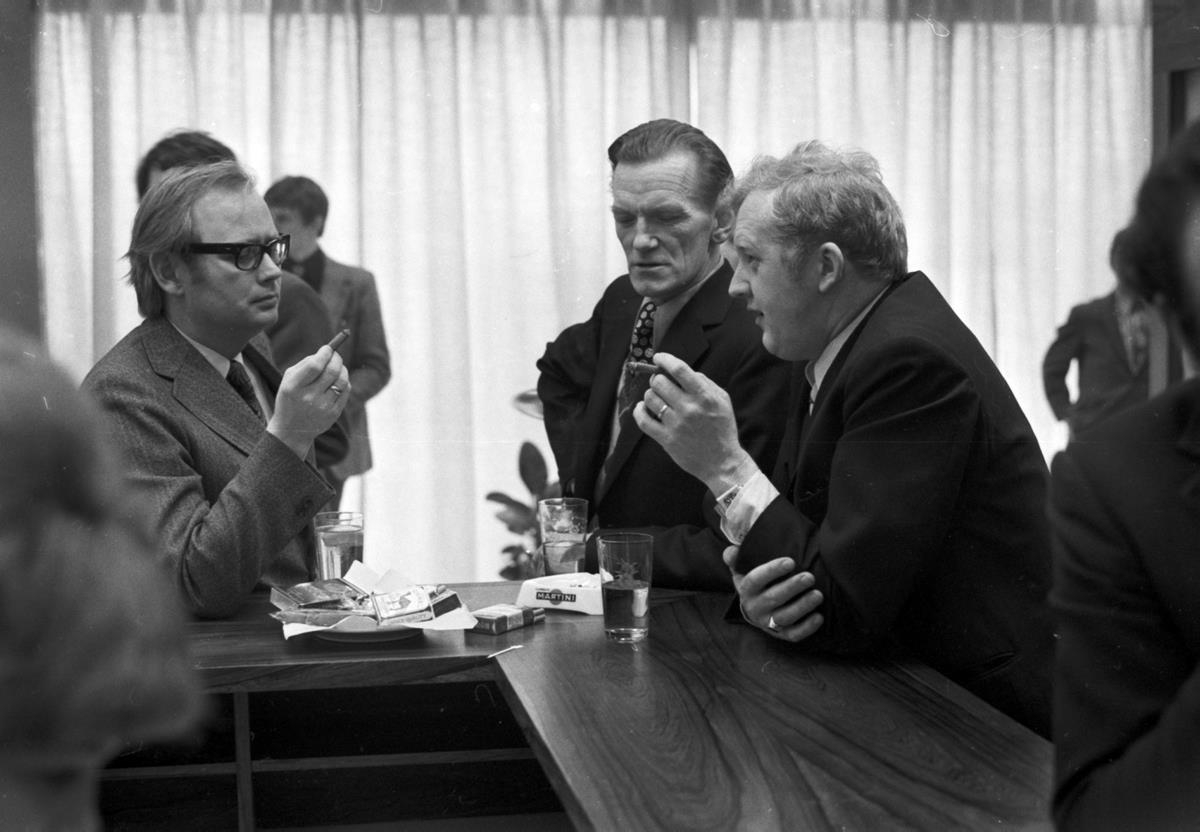 Frá opnun nýs húsnæðis Útvegsbankans í Keflavík. Karl Steinar Guðnason og Jón Pétur Guðmundsson meðal gesta.
