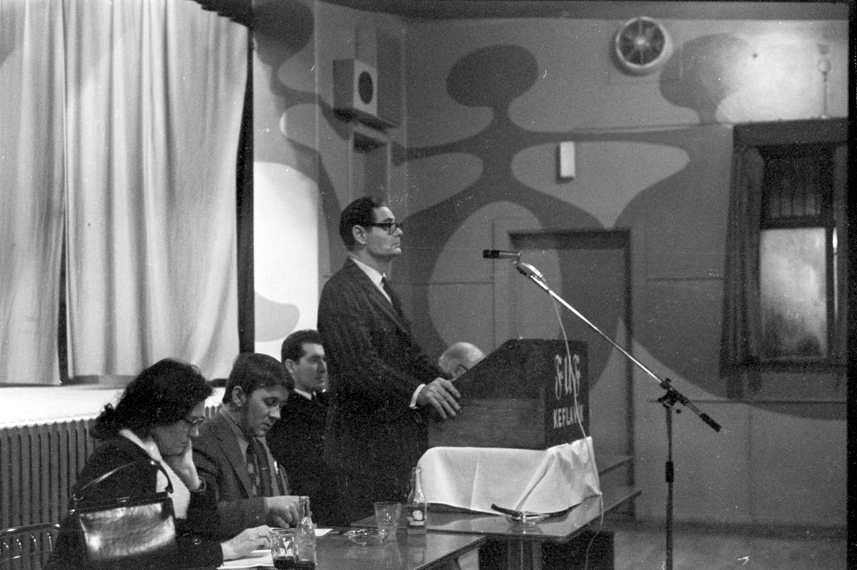 Frá fundi með fjármálaráðherra, Halldóri E. Sigurðssyni í Ungó. Sigurður Brynjólfsson í pontu