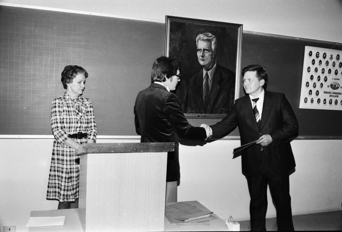 Iðnskólinn fær afhent málverk af Hermanni Eiríkssyni. Á myndinni eru Ingigerður Sigmundsdóttir, eiginkona Hermanns, óþekktur og Ingólfur Halldórsson