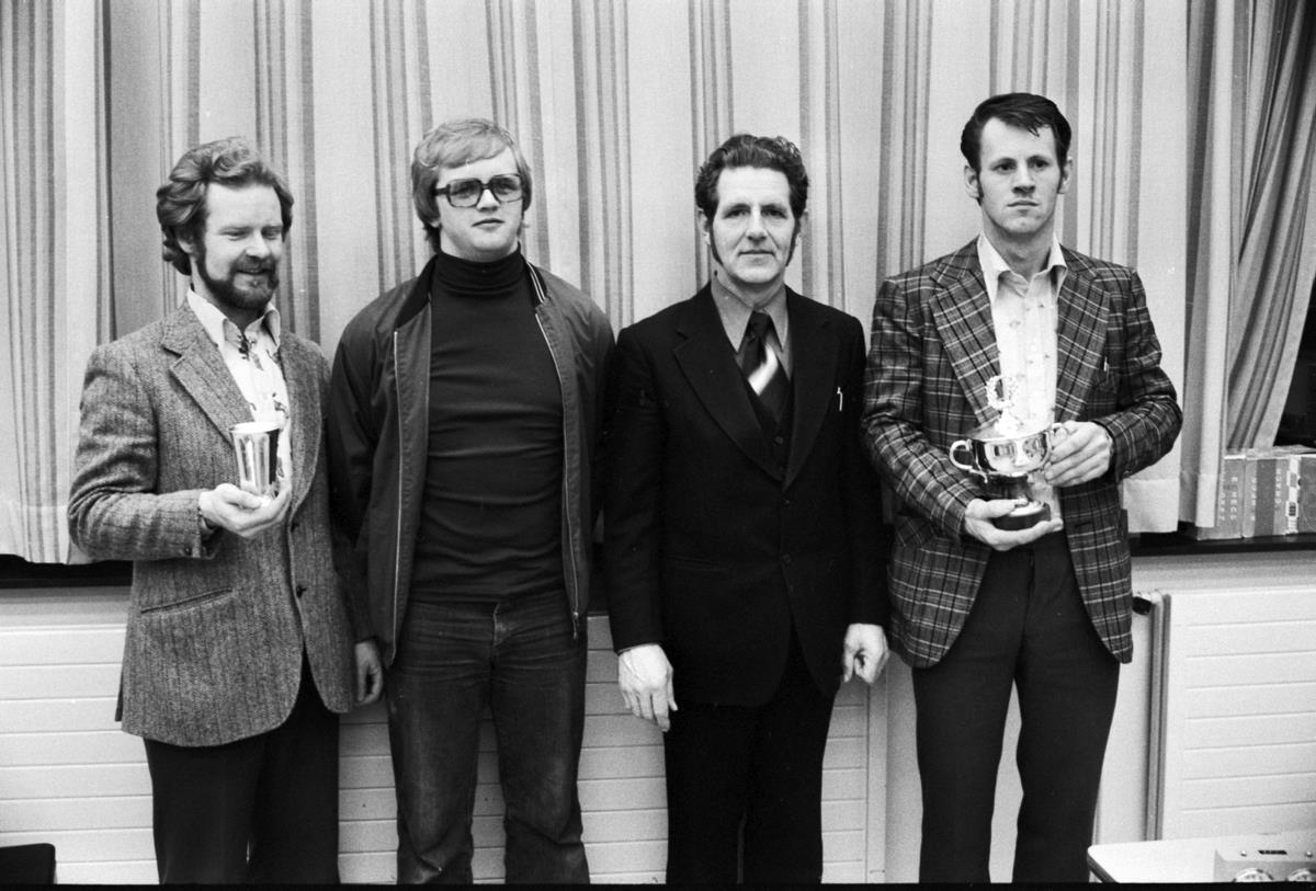 Frá skákkeppni stofnana. Sigursveitin frá Kaupfélagi Suðurnesa/Skipaafgreiðslu Suðurnesja. Sigfús Kristjánsson og Pálmar Breiðfjörð lengst til hægri