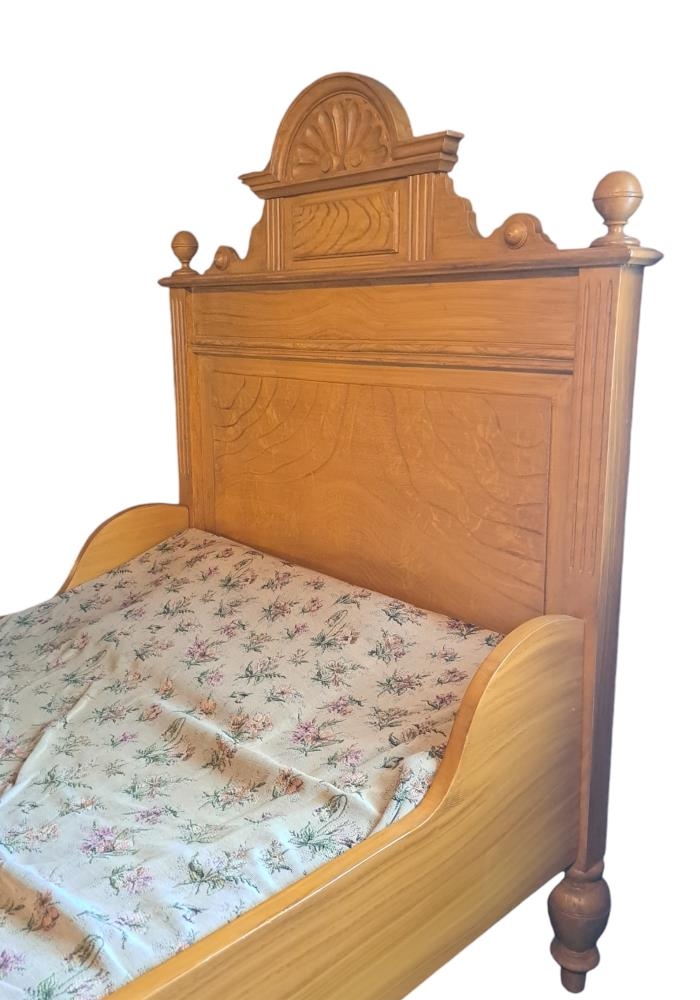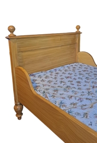 Tvíbreitt rúm úr ljósum við og með háum gafli.
