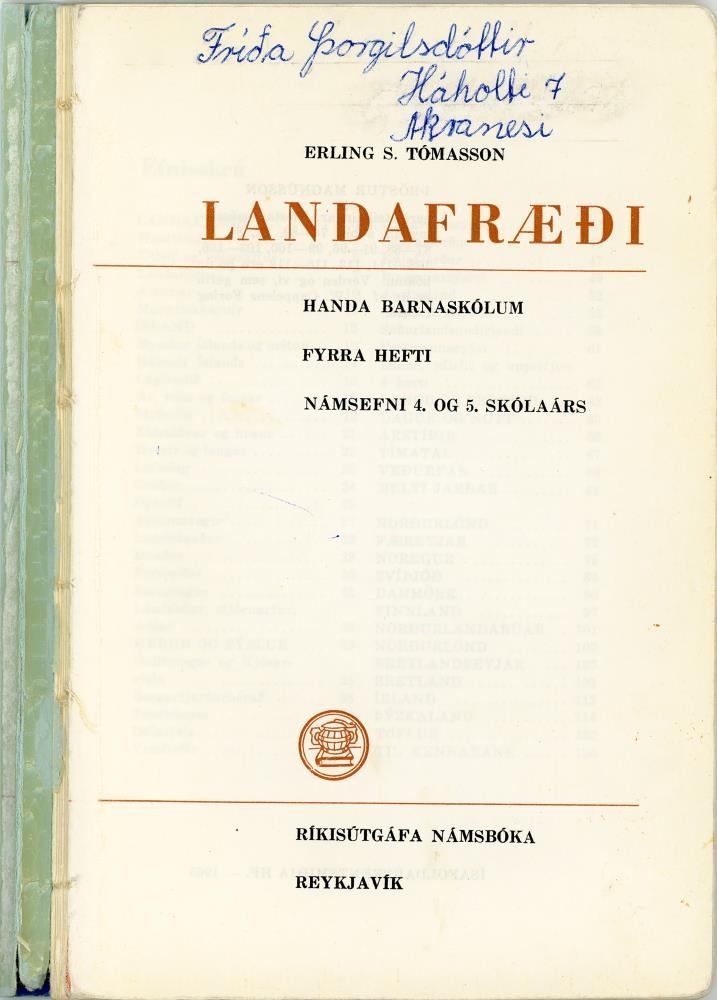 Landafræði handa barnaskólum : fyrra hefti, námsefni 4. og 5. skólaárs / Erling S. Tómasson ; Þröstur Magnússon gerði teikningar. - 128 bls. : myndir, kort, töflur