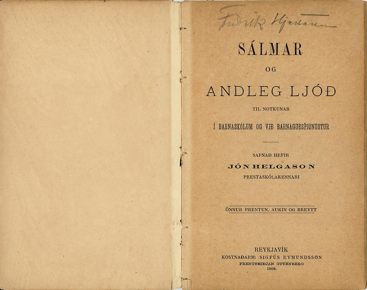 Sálmar og andleg ljóð til notkunar í barnaskólum og við barnaguðþjónustur : Barnasálmabókin / safnað hefir Jón Helgason. - 2. prentun, aukin og breytt. - 64 bls.