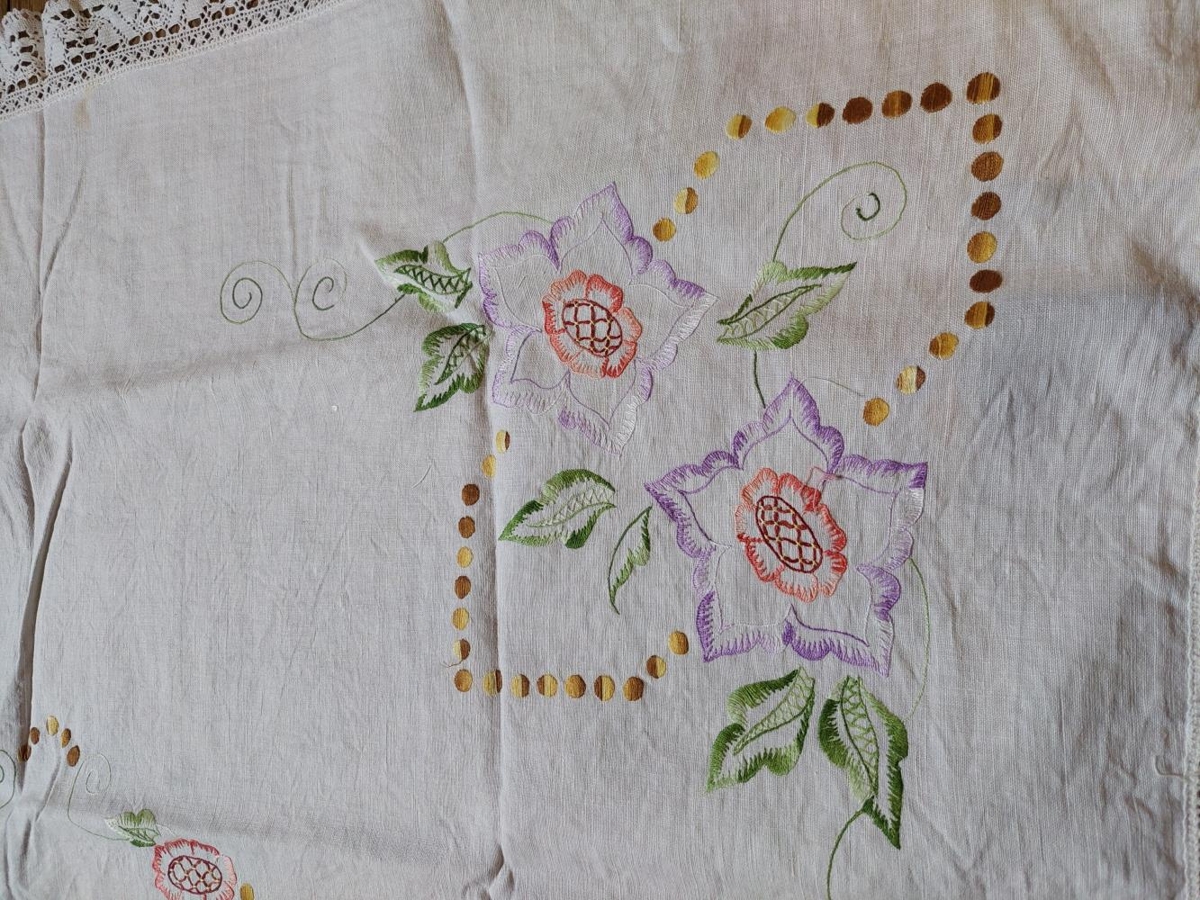 Borðdúkur, breidd er 129 cm og lengd 132 cm. Dúkurinn er útsaumaður, í fjórum hornunum er samskonar mynstur, tvö stór fjólublá og bleik blóm, 7 lauf þar í kring. Sitthvoru megin við blómin eru hringir sem mynda einskonar turn, 17 hringir eru innan megin á dúknum en 19 hringir utan. Utan um allan dúkinn er blúnda. Í miðjunni er blómakrans.