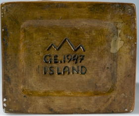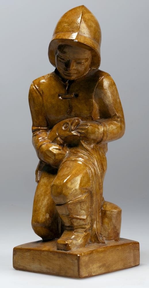 Ungur sjómaður, frummynd. Stytta úr gifsi sem sýnir sjómann, krjúpandi á lágum stöpli, að losa fisk úr neti. Við hlið hans er bryggjustólpi. Styttan er svokallaður kjarni eða „master" sem er hin eiginlega frummynd sem notuð er til að búa til mót fyrir keramikgripi (sjá nánar hér að neðan). Guðmundur Einarsson mótaði styttuna árið 1947 og er hún merkt honum en á botn styttunnar er grafið GE.1947 ISLAND og merki Listvinahússins (burstir á burstabæ). Ummerki eru um að höfuðið hafi brotnað af á einhverjum tímapunkti og verið fest aftur á. Borið hefur verið á styttuna efni af einhverju tagi sem gerir hana brúna á litinn, undir stöplinum má á nokkrum stöðum sjá glitta í hvítt gifs þar sem aðeins hefur brotnað upp úr styttunni. Gerðar hafa verið litlar lagfæringar ofan á sjóhattinum og undir stöplinum en þar er brúni liturinn ljósari. Hæð: 30 cm, breidd: 11 cm, stöpull: 9,5 x 2,5 x 11 cm.