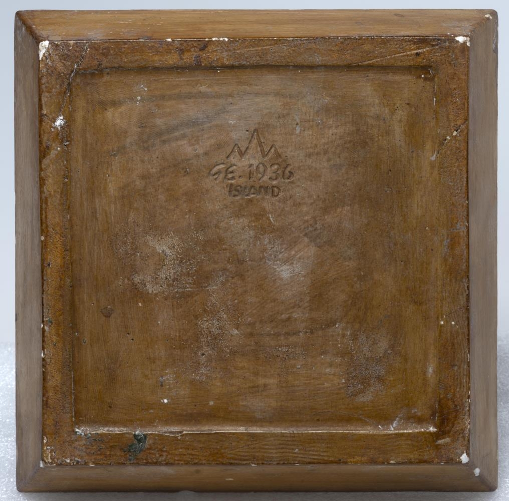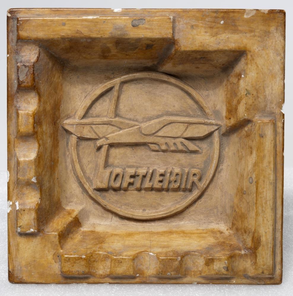 Loftleiðir öskubakki, frummynd. Öskubakkinn er úr gifsi og er ferningslaga með 8 statífum fyrir sígarettur. Hann er í Art Deco stíl. Ofan í öskubakkanum stendur upphleyptum hástöfum: Loftleiðir og merki þeirra. Öskubakkinn er svokallaður kjarni eða „master" sem er hin eiginlega frummynd sem notuð er til að búa til mót fyrir keramikgripi (sjá nánar hér að neðan). Á botn öskubakkans er grafið GE. 1936 ÍSLAND og merki Listvinahússins (burstir á burstabæ). Öskubakkinn er búinn til í Listvinahúsinu og er eftir Guðmund frá Miðdal. Borið hefur verið á öskubakkann efni af einhverju tagi sem gerir hann brúnann á litinn. Ofan í skálinni í kringum merki Loftleiða er liturinn ljósari og ekki jafn glansandi. Brotnað hefur upp úr öskubakkanum á nokkrum stöðum og þar má sjá glitta í hvítt gifs. Hæð: 3,5 cm, breidd: 17 cm, lengd: 17 cm.