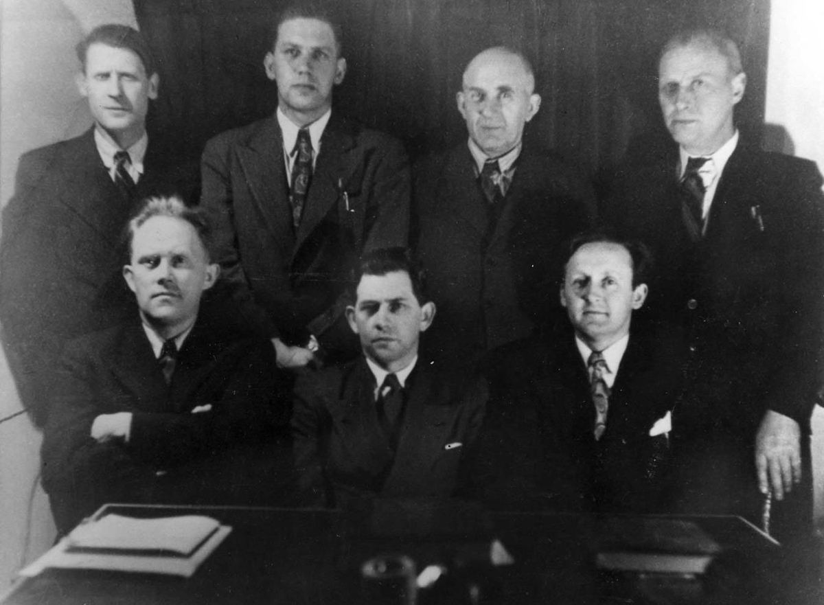 Efri röð frá vistri: Helgi Eyjólfsson, Bjarni Albertsson, Guðmundur Guðmundsson, sparisjóðssjtóri, Steindór Pétrsson. Fremri röð frá vinstri: Valtýr Guðjónsson, Ragnar Guðleifsson og Jón Tómasson.
