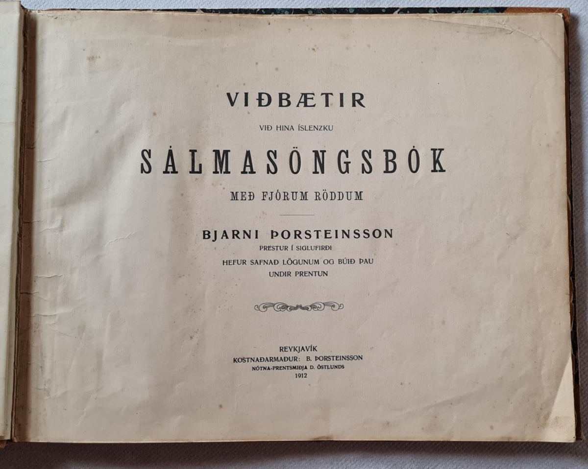 Bókin heitir "Viðbætir við hina íslenzku sálmasöngsbók með fjóum röddum". Á forsíðu stendur ennfremur: Bjarni Þorsteinsson prestur í Siglufirði hefur safnað lögunum og búið þau undir prentun. Reykjavík. Kostnaðarmaður: B. Þorsteinsson Nótna-prentsmiðja D. Östlunds 1912. Eigandi var Sigurður Gunnarsson oddviti og bóndi á Ljótsstöðum Vopnafirði (1895-1974) Gefandi er dóttir hans.