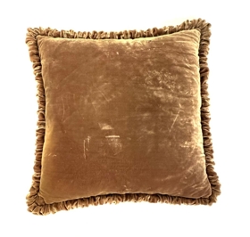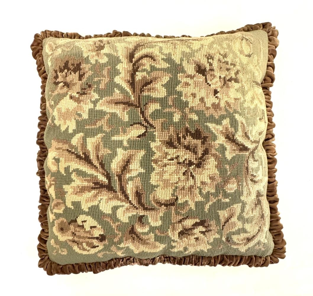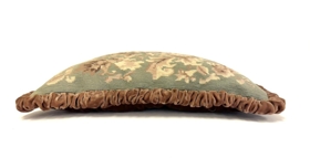 Skrautpúði útsaumaður. Ferkantaður flauelspúði með rykkingum og útsaum. Öll framhliðin er útsaumuð með blómamunstri í grænum og brúnum tónum. Flauelsefni í rykkingum og baki er brúnt á lit.
