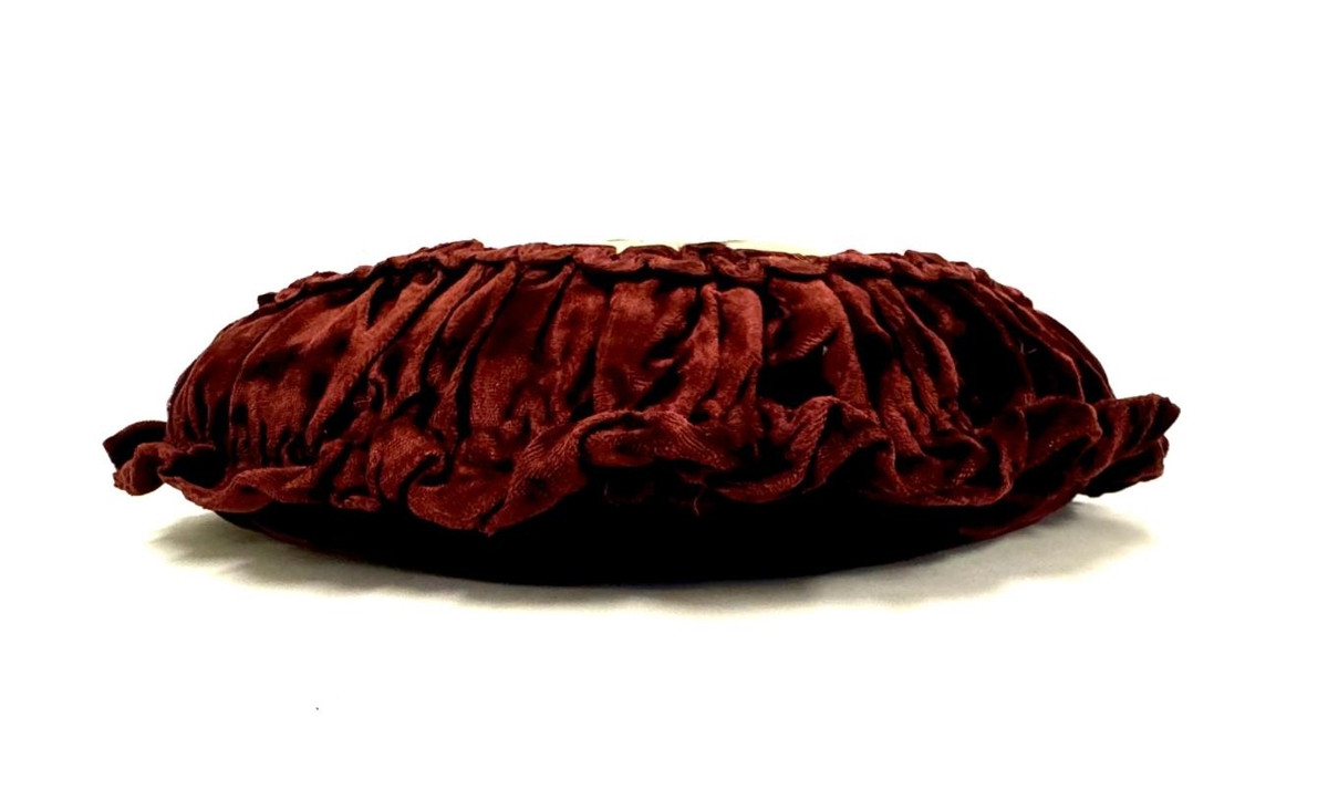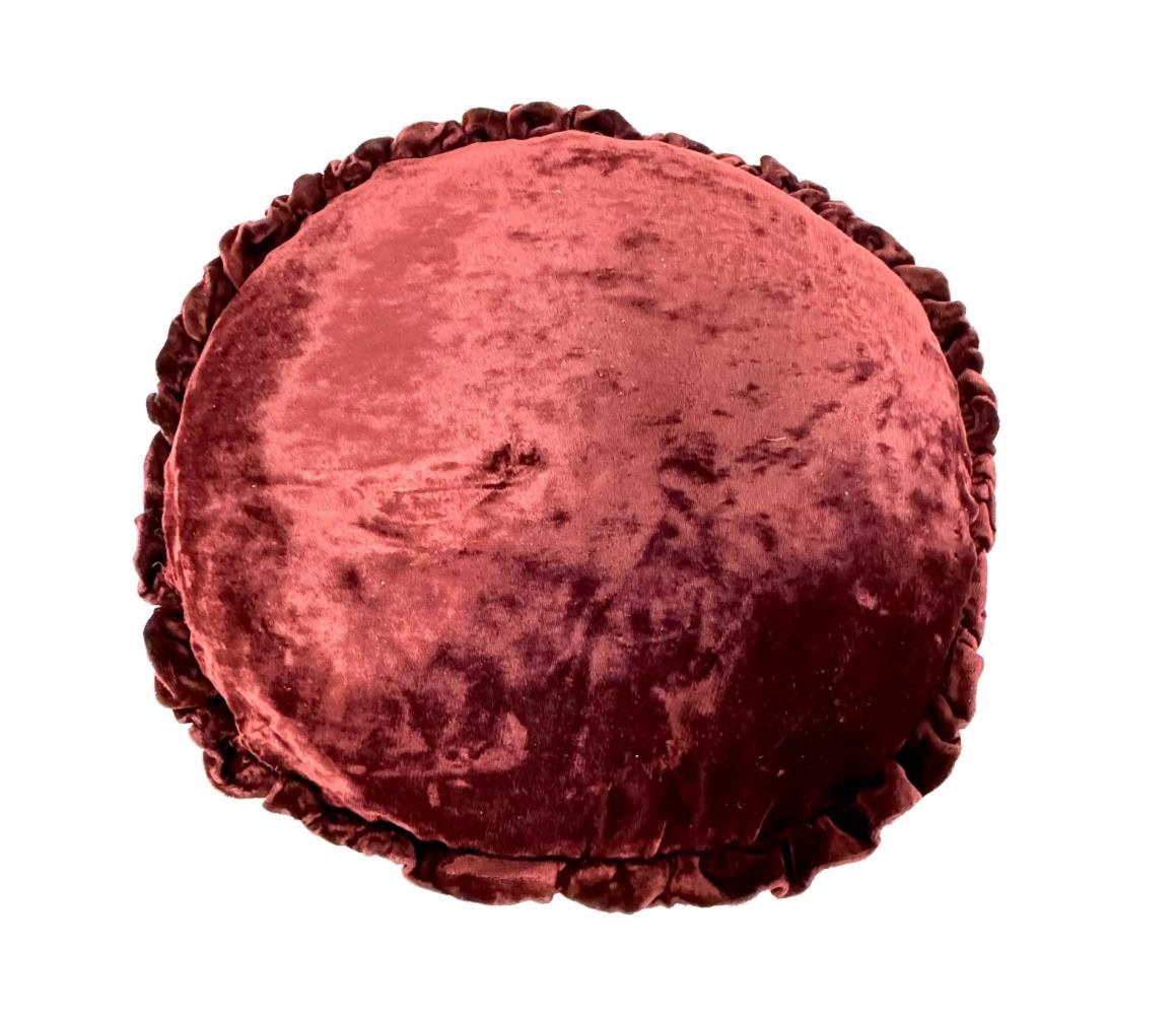 Rauður hringlaga skrautpúði úr flauelsefni. Öll framhliðin er með útsaum, gul blóm og grænar jurtir. Rykkingar allan hringinn.