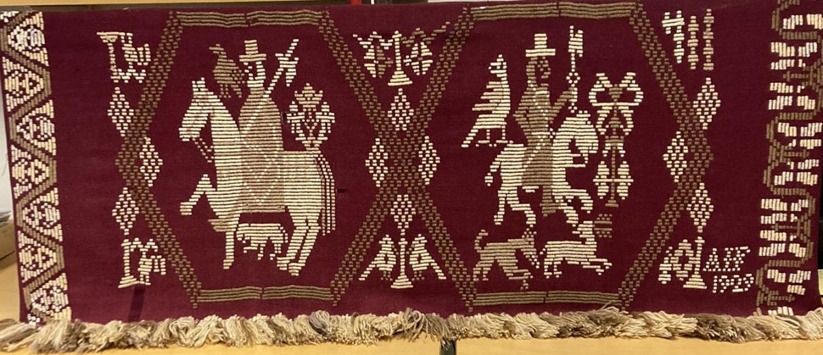 Veggrefill. Vínrauður ullarjafi. Útsaumað riddaramynstur með ljósu og brúnu ullargarni í sauðalitum, glitsaumur. Kögur að neðan. Merkt Á.I.F. 1929. Verk Árnýjar Ingibjargar Filippusdóttur Skólastjóra.