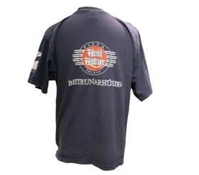 Dökkblár bolur með auglýsingum á bringu, baki og ermum.