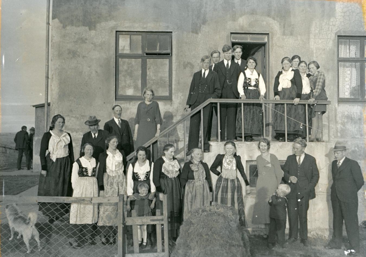 Prúðbúinn mannfjöldi fyrir framan steinsteypt hús. Skírnarveisla Sigríðar Lýðsdóttur vorið 1935. Við vesturhlið Litlu-Sandvíkur í Flóa.