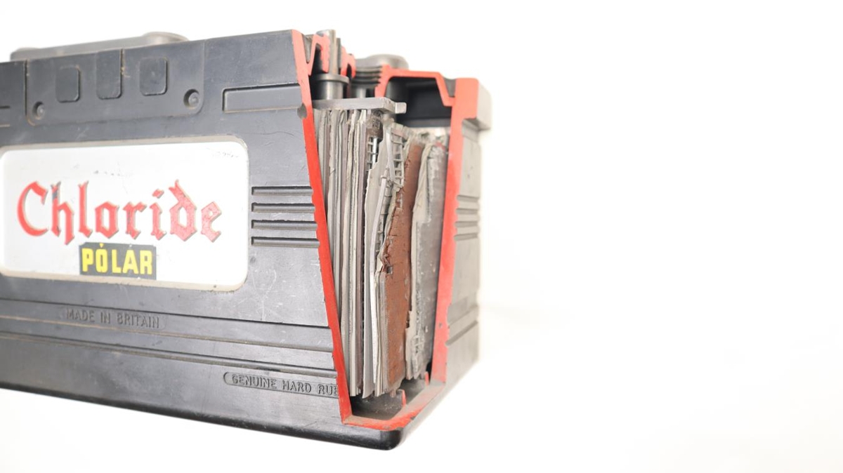 Rafgeymir sem skorin hefur verið sneið af horni, til þess að nýta í kennslu. Þá sést innvols geymisins. Áletrun: "Chloride, POLAR. Made in Britain".