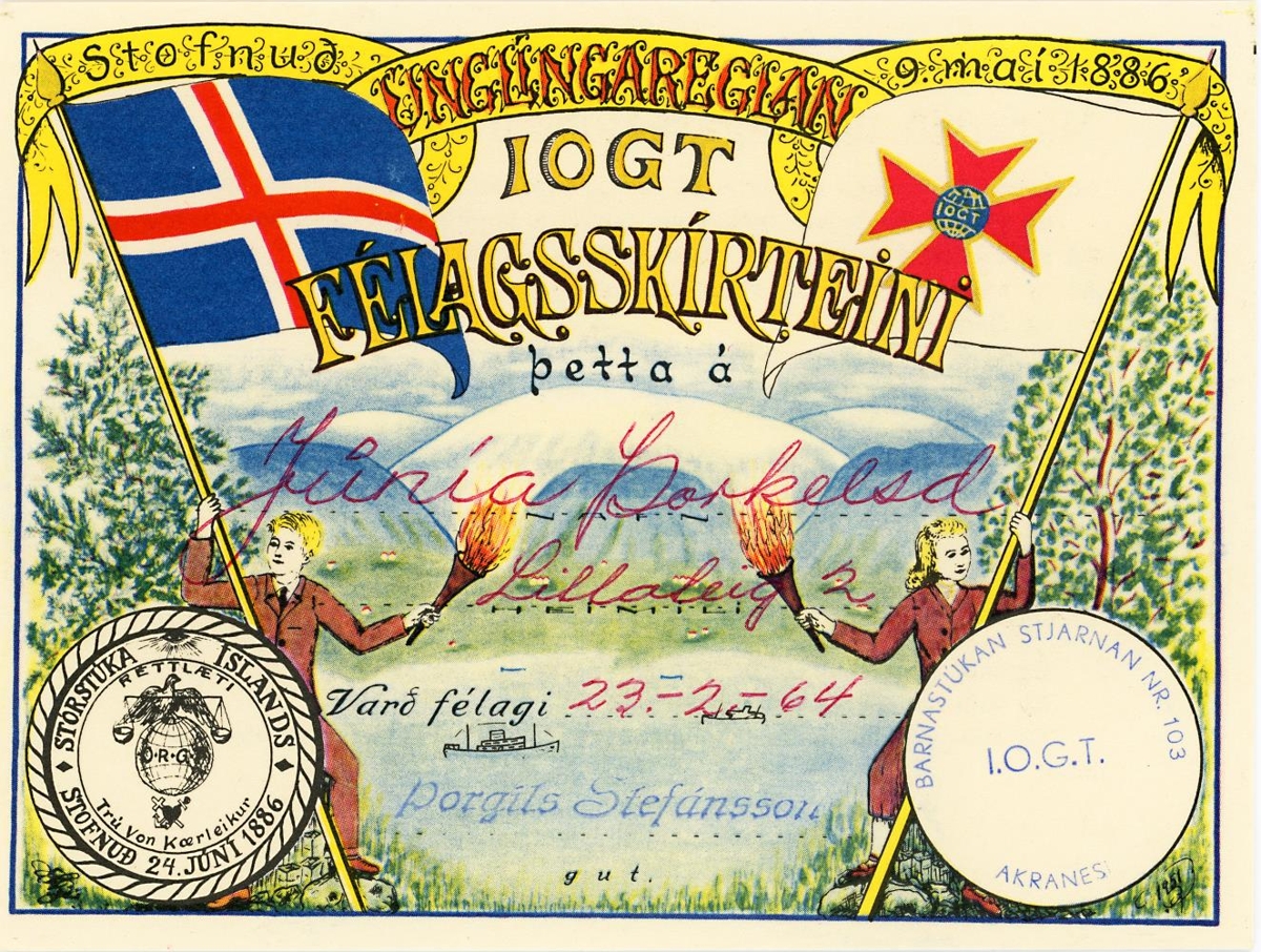Texti: Unglingareglan IOGT Félagsskírteini þetta á Júnía Þorkelsdóttir. Varð félagi 23-2-64. Þorgils Stefánsson
