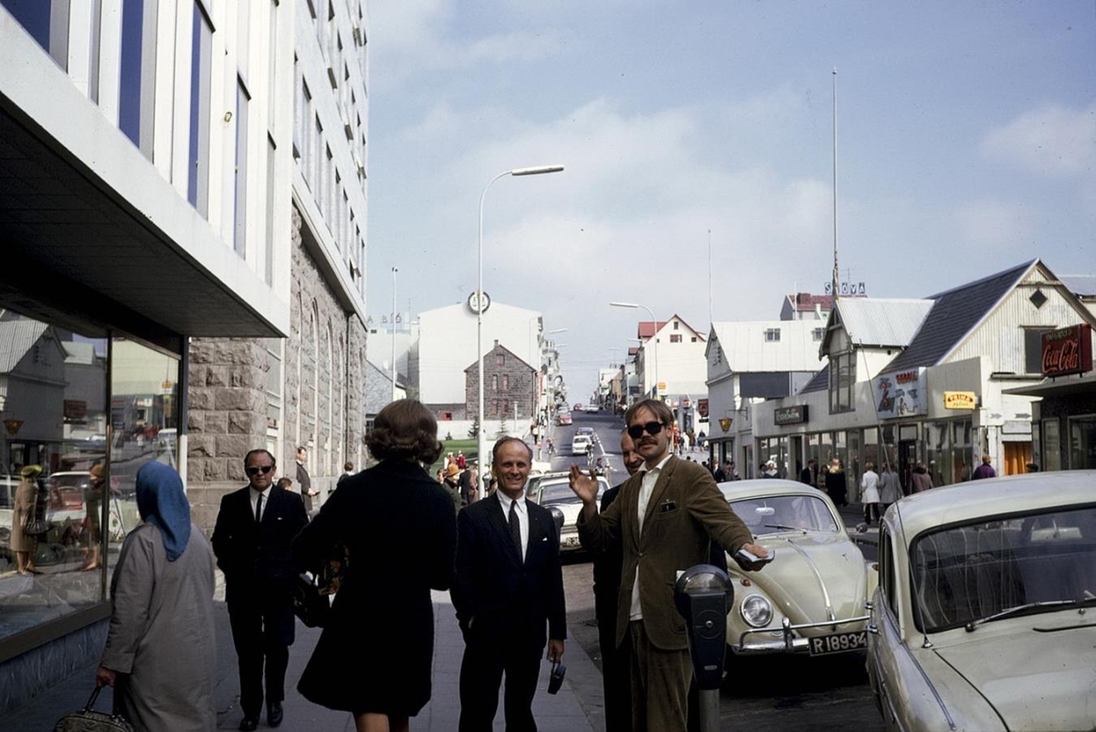 Reykjavík. Ferðafélagar í Austurstræti, VW bjalla í stæði, sennilega farartæki þeirra.