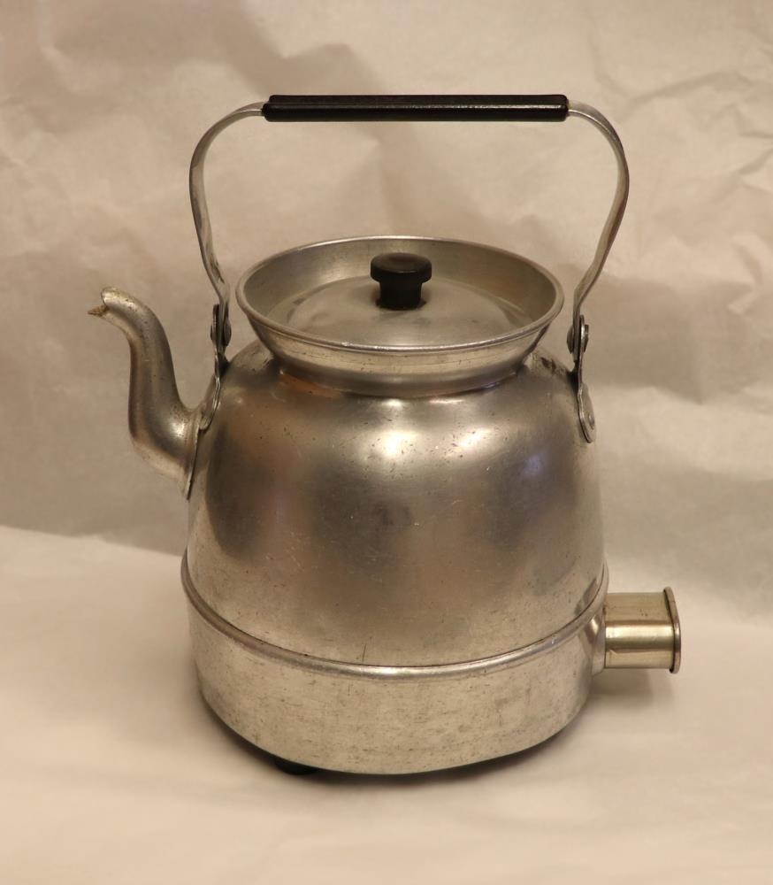 Hraðsuðuketill úr áli ásamt rafmagnssnúru. Líklega af fyrstu kynslóð slíkra katla. Frá Sigríði Guðjónsdóttur Bachmann í Borgarnesi. Kom ásamt munum frá nr. 3583-3616.