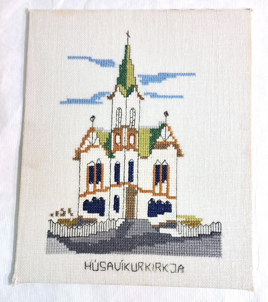 Útsaumuð mynd af Húsavíkurkirkju límd á pappaspjald.