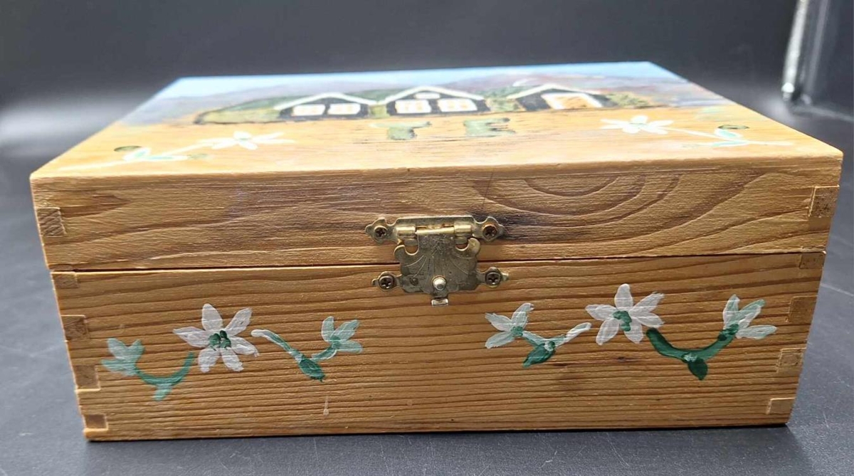 Tekassi úr tré, Ásdís Jónsdóttir málaði mynd á kassann