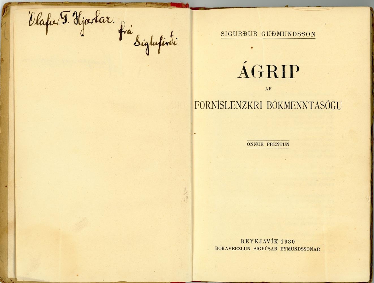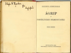 Ágrip af forníslenzkri bókmenntasögu / Sigurður Guðmundsson. - 2. prentun. - 131 bls.