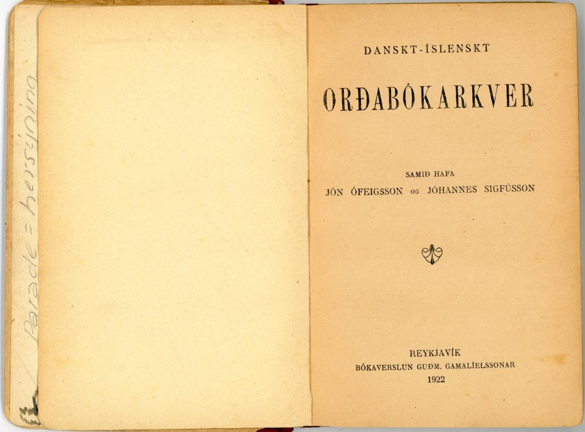 Danskt-íslenskt orðabókarkver / samið hafa Jón Ófeigsson og Jóhannes Sigfússon. - vi, 160 bls.
