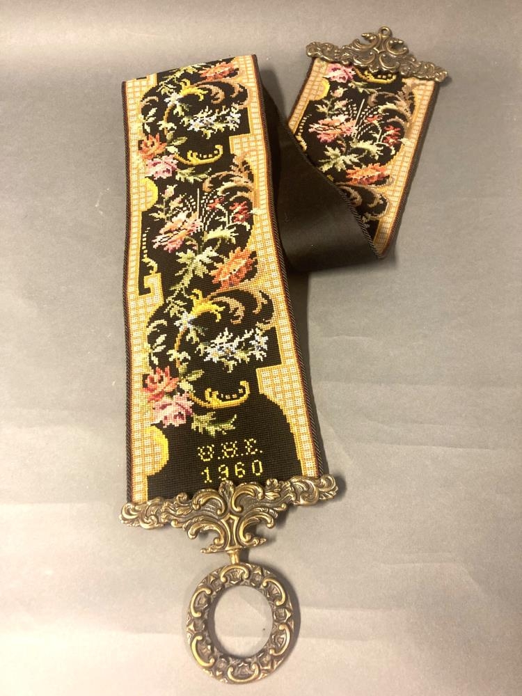 Klukkustrengur útsaumaður með krosssaumi. Verk Valgerðar Helgadóttur frá Hólmi í Landbroti. Merktur henni og með ártalinu 1960.