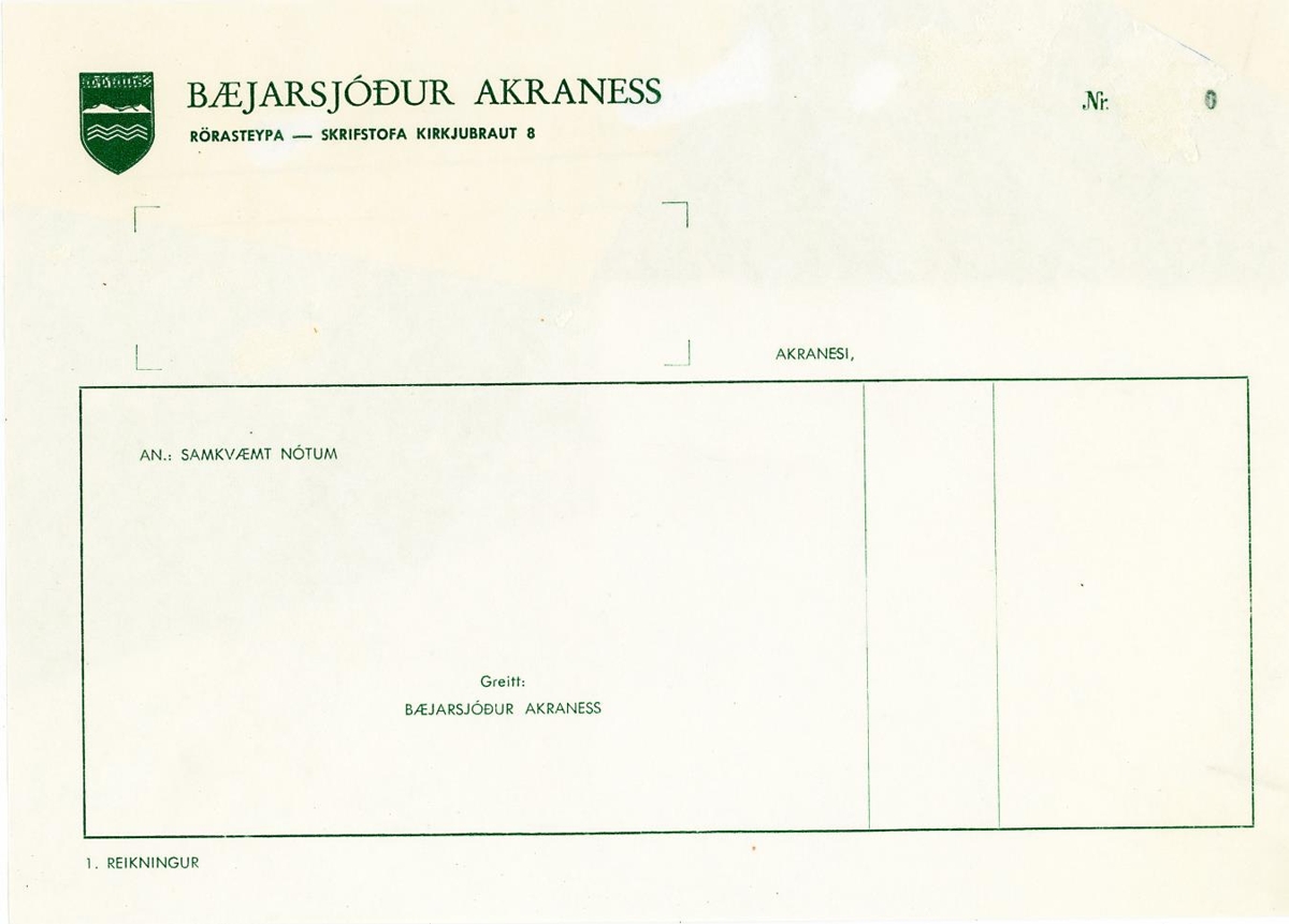 Reikningeyðublað frá Bæjarsjóð Akraness