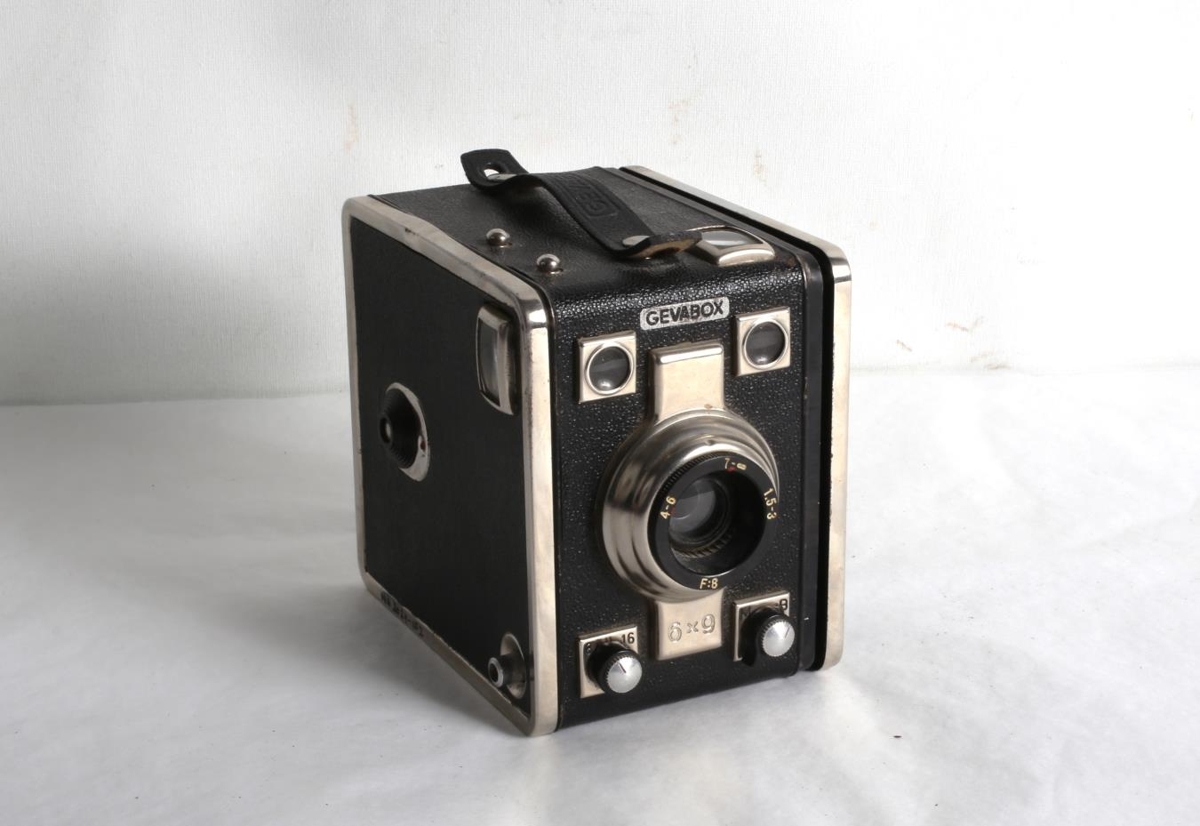 Svört kassamyndavél af gerðinni "Gevart Gevabox 6x9". Myndavélin úr búi foreldra gefanda, þeirra Hans Kristins Aðalsteinssonar og Láru Ásgerðar Albertsdóttur.
