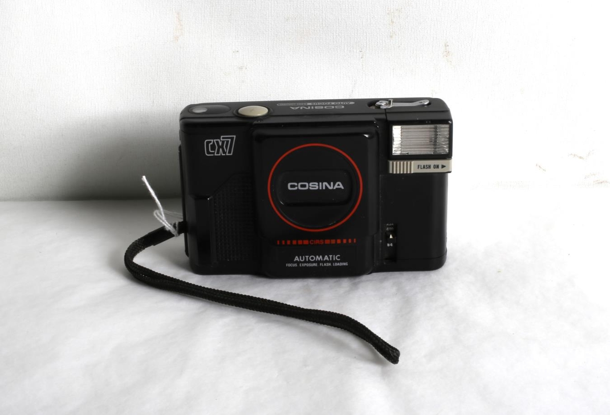 Myndavél af gerðinni "Cosina CX7" með flassi. Myndavélin úr búi foreldra gefanda, þeirra Hans Kristins Aðalsteinssonar og Láru Ásgerðar Albertsdóttur.