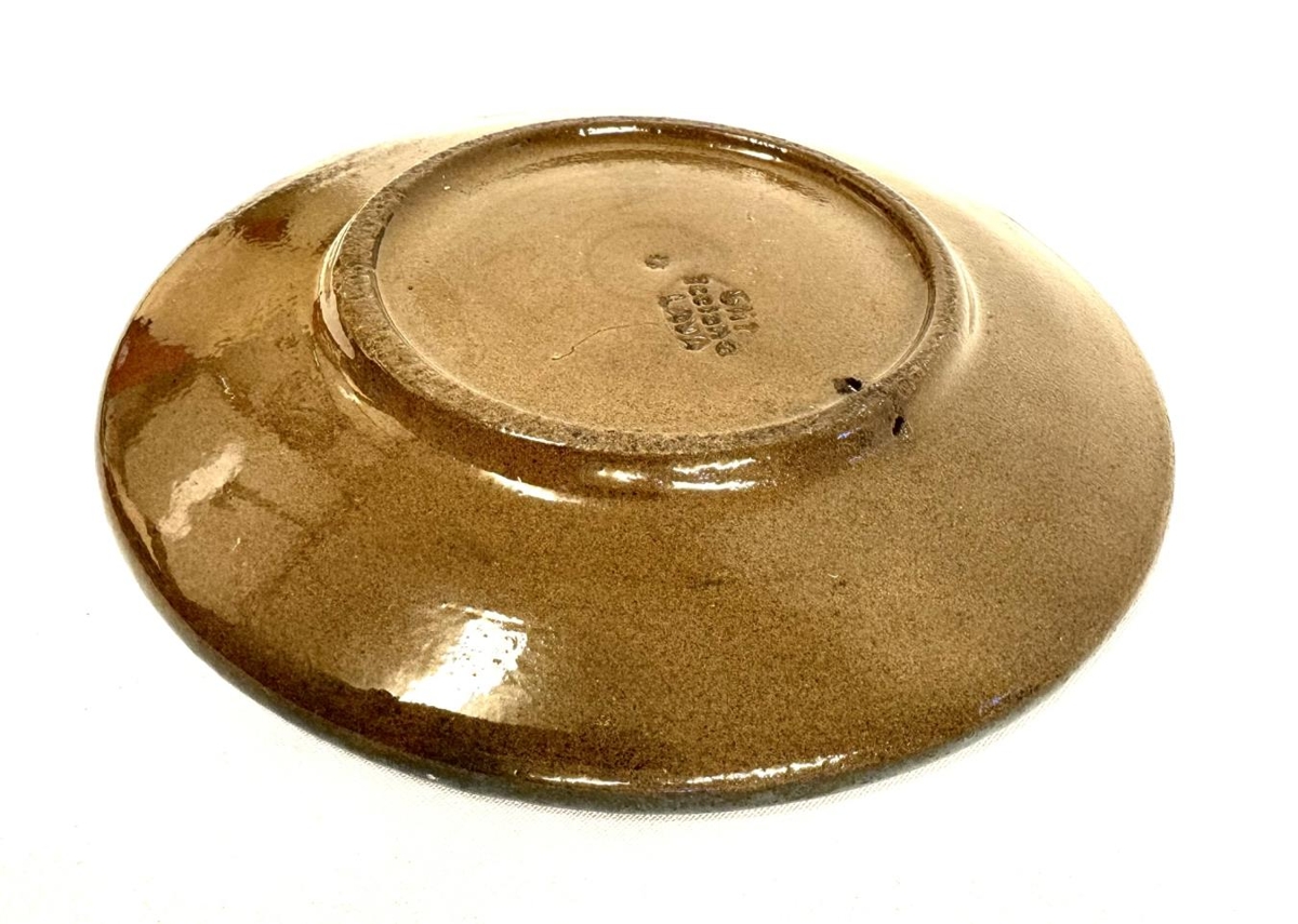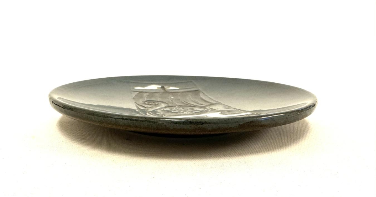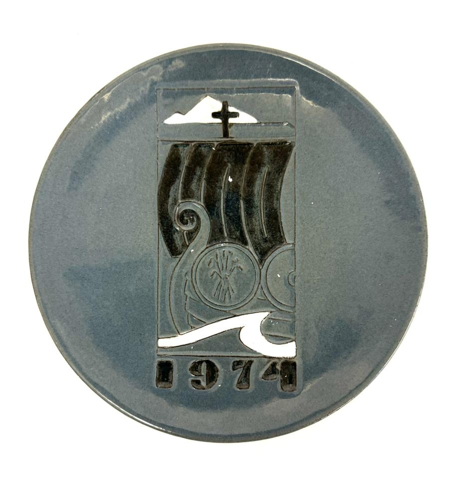 Veggplatti úr leir. Framleiddur hjá Glit, merktur; Glit, Iceland, Lava. Brúnn leir en blámálaður og glerjaður að framan. Framleiddur í tilefni af 1100 ára afmæli íslandsbyggðar árið 1974. Myndefni sýnir víkingaskip fyrir fullum dökkum seglum, Kross teygir sig upp úr siglutréinu og fjöll í baksýn. Fjöllin eru líklega Súlur. Plattinn er hannaður af myndlistarmanninum Kristni G. Jóhannessyni. Merkið á að tákna siglingu Helga magra og Þórunnar hyrnu inn Eyjafjörð og er talan 1100 letruð á seglin. Kornbundin, merki Akureyrar, er markað á skjöld á borðstokki, krossmarkið er efst í siglu og útlínur fjallsins Súlna í Eyjafirði eru í baksýn.