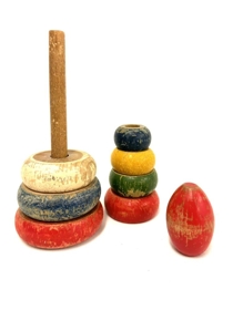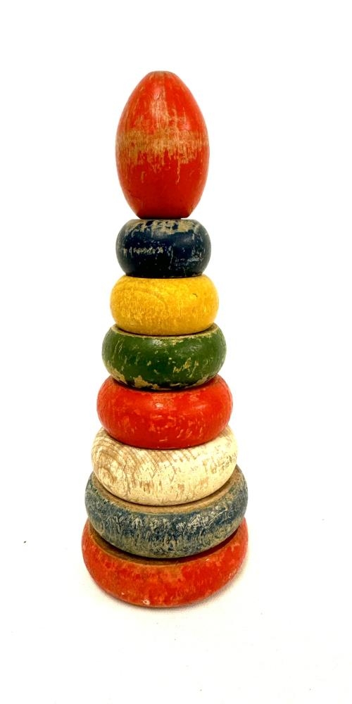 Marglitur kubbaturn. Tréhringir sem raðast saman á stöng. Þroskaleikfang, börn raða hringjum frá þeim stærsta og upp í þann minsta. Undir leikfangið hefur verið límdur límmiði sem á stendur; King´s Lege ca. 1940