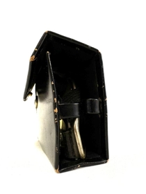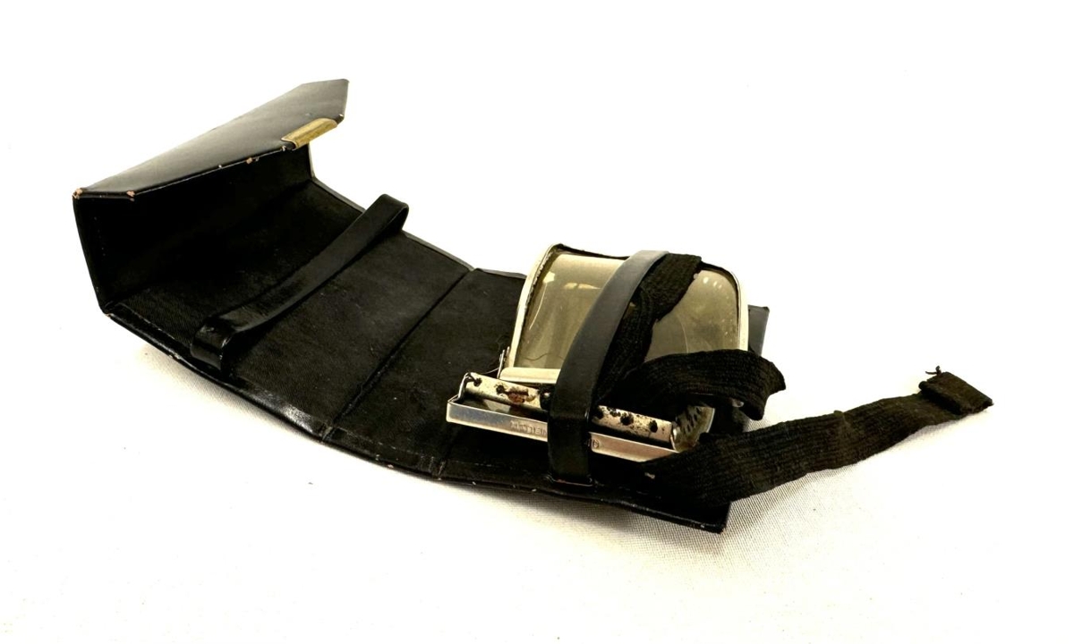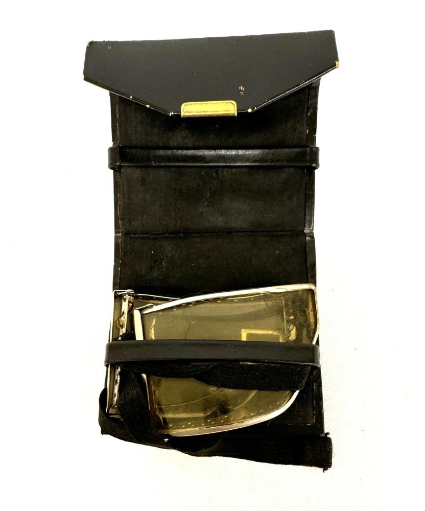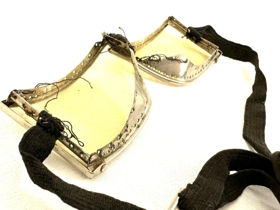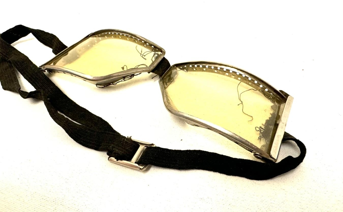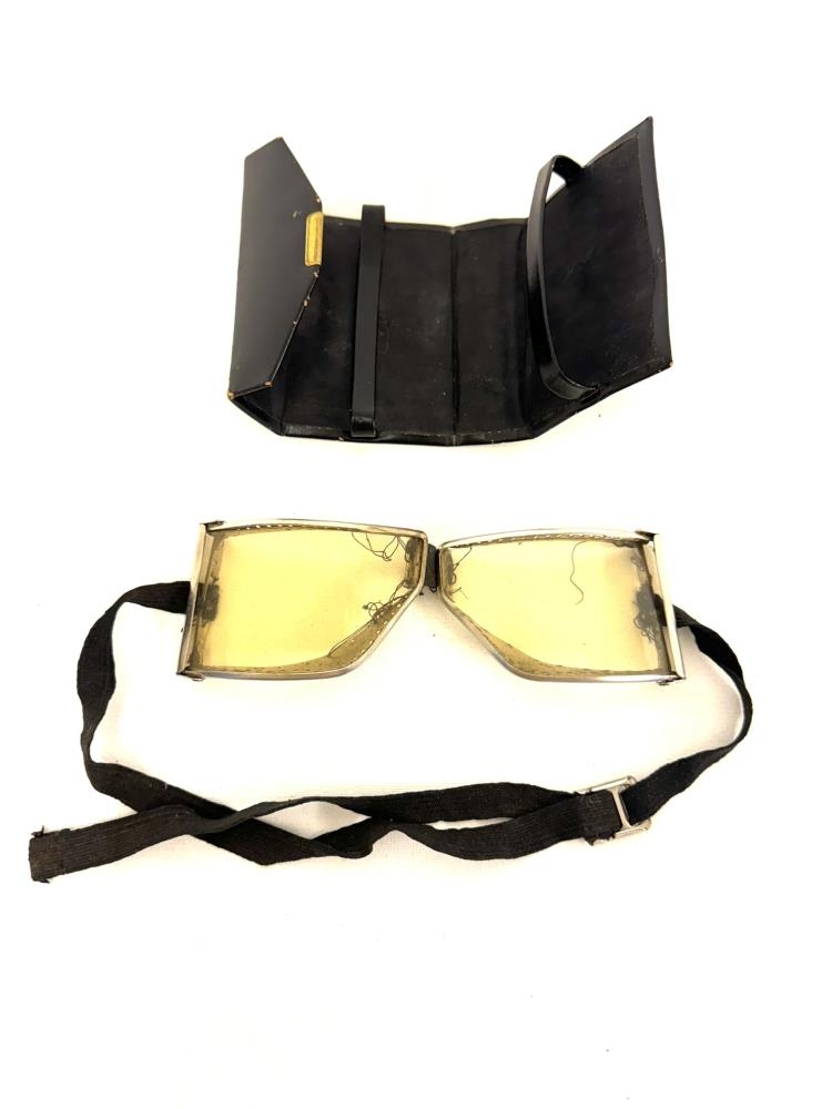 Gleraugu/ skíðagleraugu. Gleraugun eru með svartri teygju, gulu gleri og umgjörðin hylur alveg augnsvæðið með stórri málmgjörð sem leggst að andlitinu. Er í svörtu leður hulstri. Gleraugun leggjast saman, nefstykkið er bara bundið saman þannig að hægt er að leggja þau alveg saman og smeygja í teygjur sem eru í hulstrinu. Gætu verið frá föður Helgu; Gunnlaugur Búi Sveinsson, eða frá ; Sveinn Tómasson, Laugargötu 3, Akureyri.