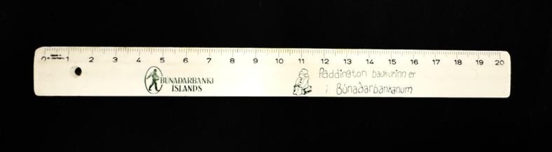 Hvít reglustika sem mælir 20 cm. Græn áletrun og myndir, frá Búnaðarbanka Íslands. Til annars endanns er merki bankans, sporöskjulaga grænn hringur með hliðarmynd af sáðmanni með poka og nafn bankans. Við hinn endann er áltrunin ; Paddington baukurinn er í Búnaðarbankanum, og mynd af teiknimyndapersónunni Paddington, björn/bangsi sem situr á ferðatösku.
