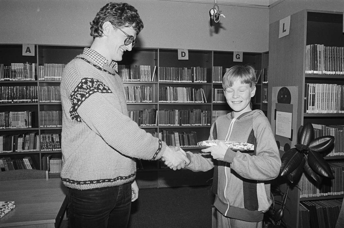 Jólaritgerðir. Eiríkur Hermannsson afhendir Erni Úlfari Sævarssyni verðlaun. Myndin er tekin í bókasafni Myllubakkaskóla. Víkurfréttir - 48. tölublað (20.12.1984), s. 16.