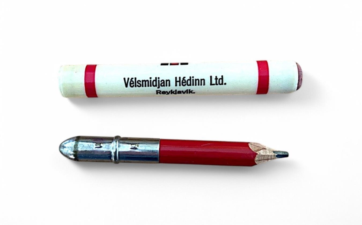 Blýantur í hulstri með loki. Áletrun: Vélsmiðjan Héðinn Ltd. Reykjavík.