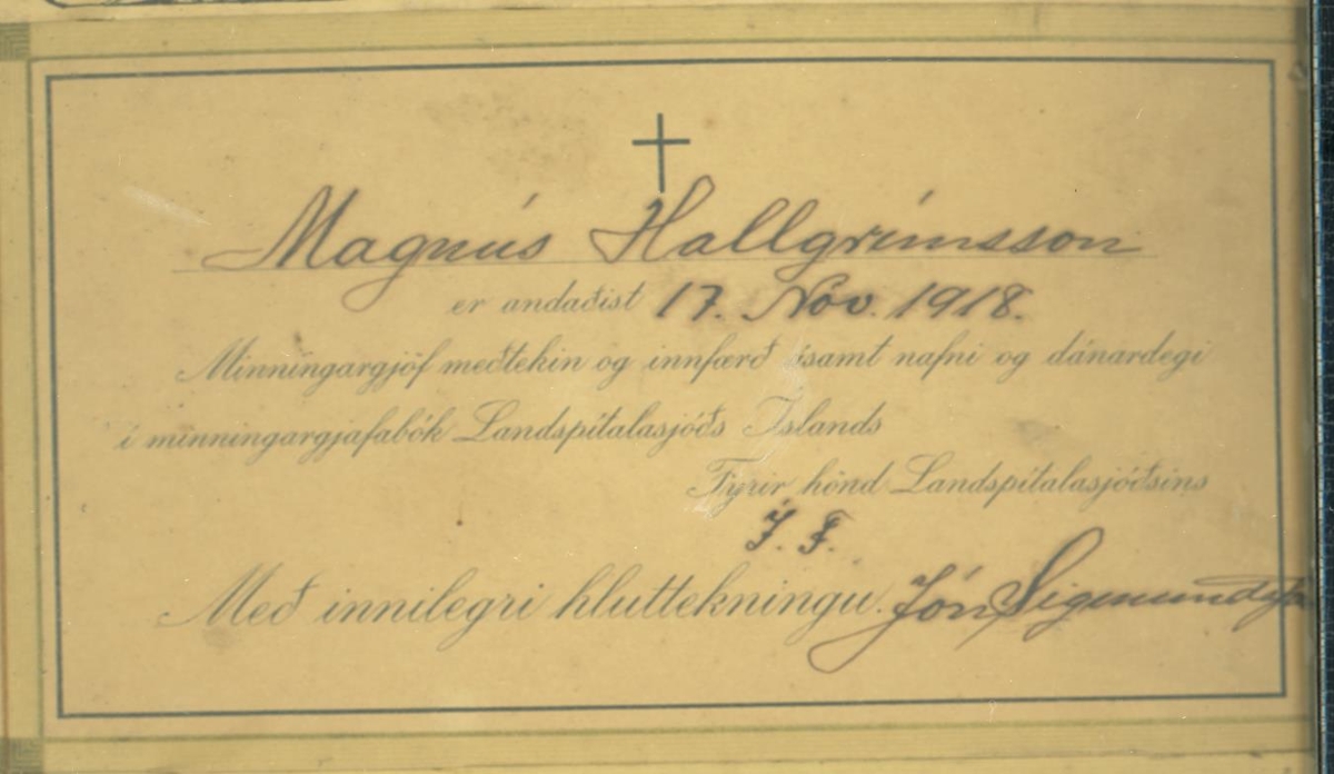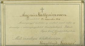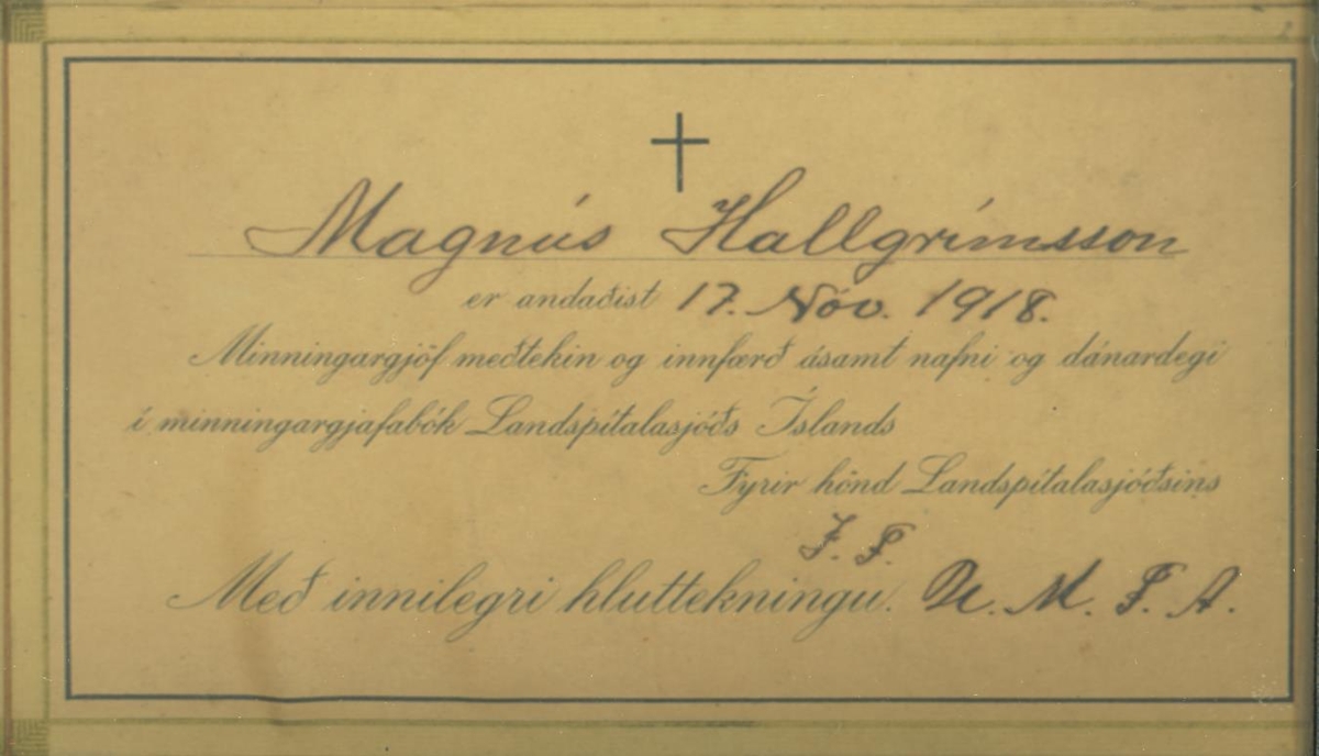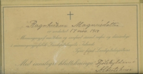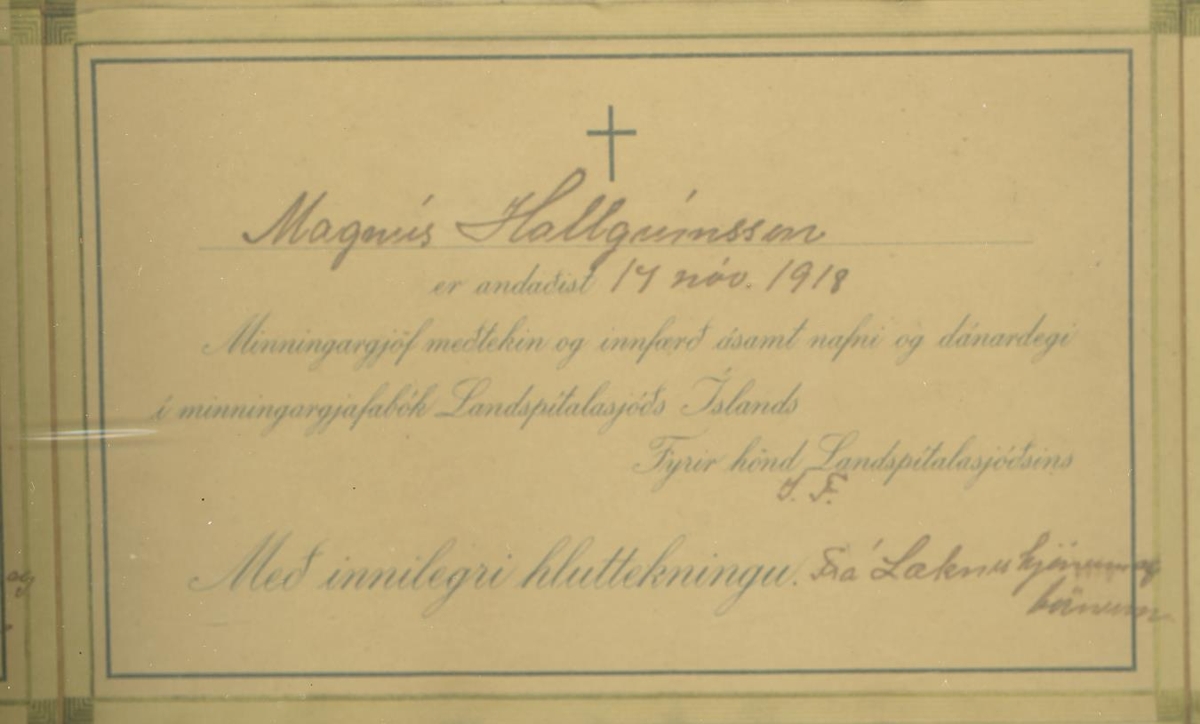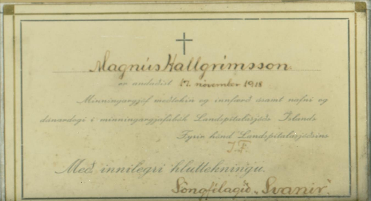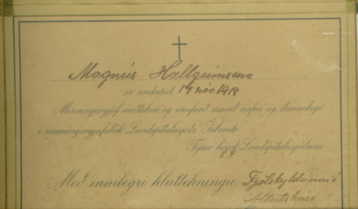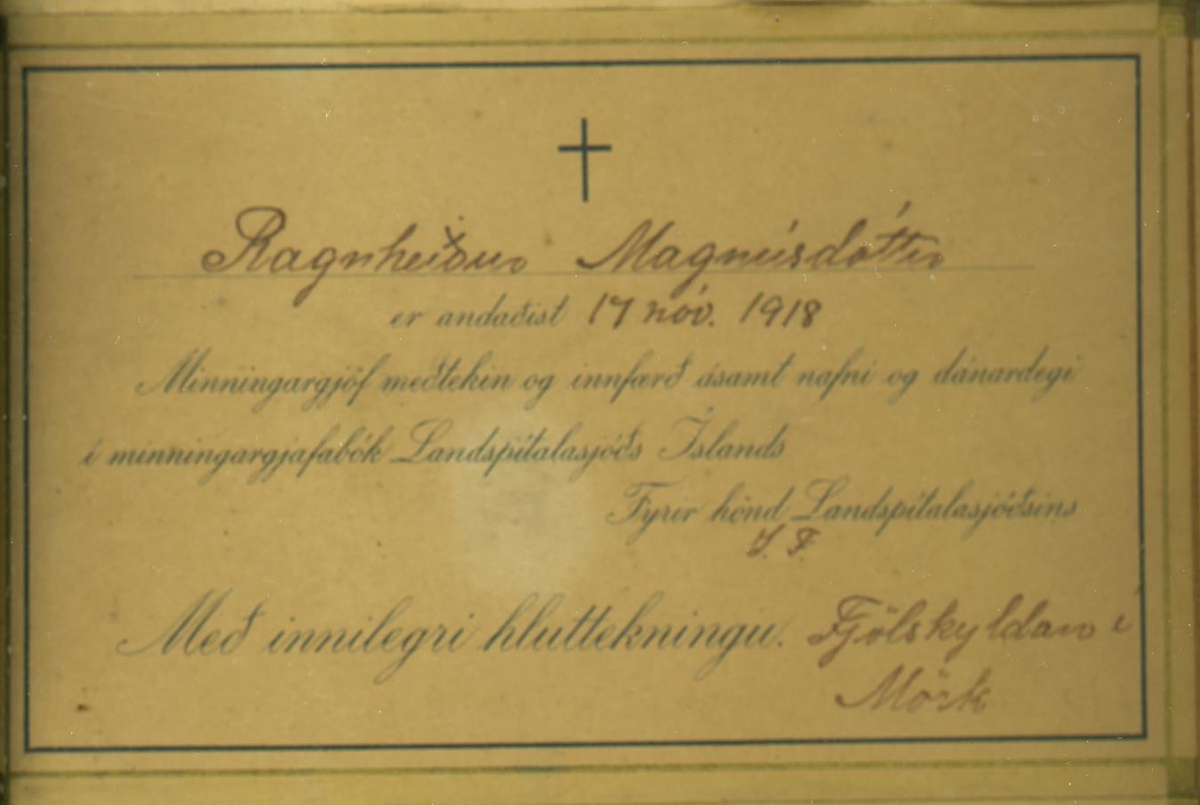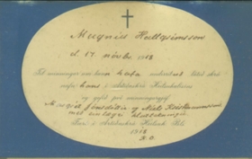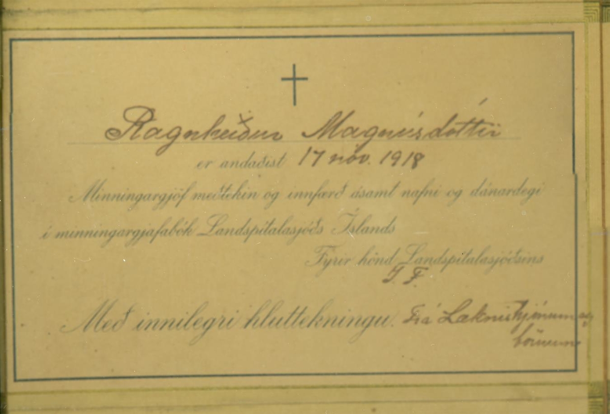 Tólf samúðarkort sem eru innrömmuð og hafa verið send vegna fráfalls Ragnheiðar Magnúsdótttur (1867-1918) og Magnúsar Tómassonar Hallgrímssonar (1901-1918). Magnús var kjörsonur Ragnheiðar.