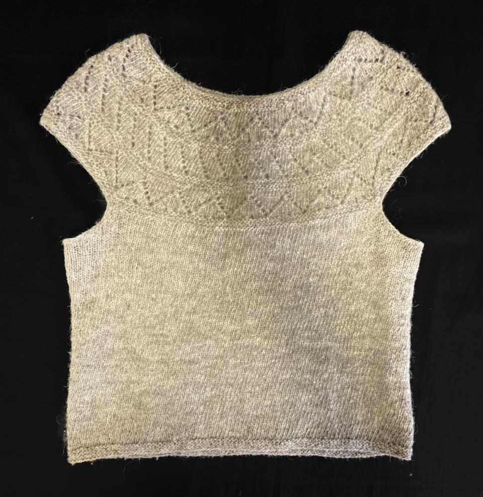 Ljósbrúnt prjónavesti. Prjónað úr garni, líklega frá Álafoss, prjónað fyrir 2000.