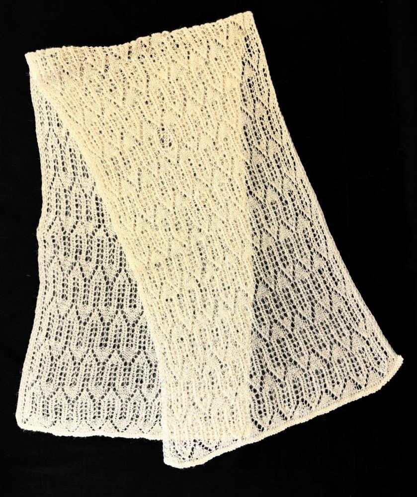 Ljóst prjónað ullarsjal með fínlegu munstri. Prjónað úr garni frá Álafoss, fyrir árið 2000.