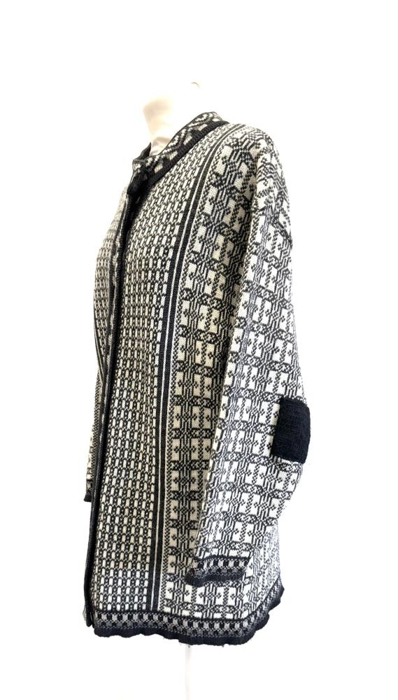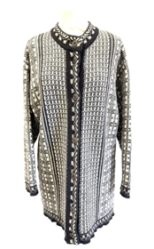 Munstruð jakkapeysa, hneppt. Vélprjónað á Foldu, Akureyri, af gefanda. Peysan er ljós með grá grænleitu, grænu munstri.