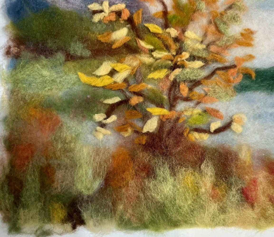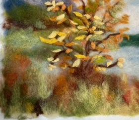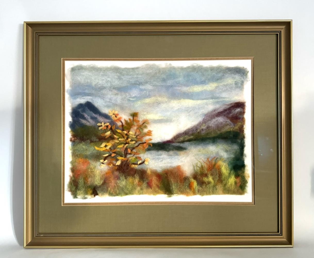 Þessi mynd er unnin úr þráðum gluggatjaldaefnis sem Ásta hirti upp af gólfi Ullarverksmiðjunnar Gefjunn á Akureyri þegar hún vann þar. Úr þessum úrgangi, sem annars hefði farið í ruslatunnuna vann hún nokkrar myndir sem þessa og gaf ættingjum og vinum.