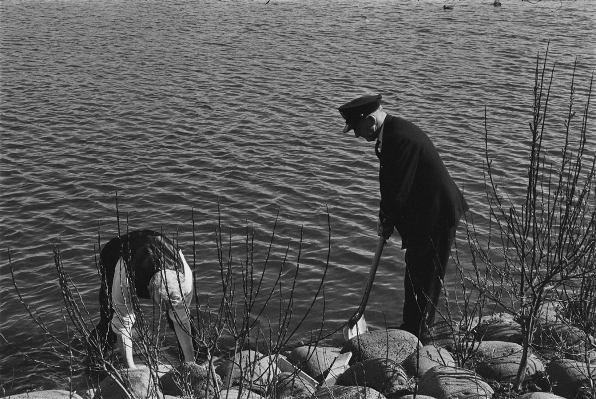 Tveir menn bjástra við að koma fyrir stiga fyrir andarunga frá grjótkanti og út í Reykjavíkurtjörn.