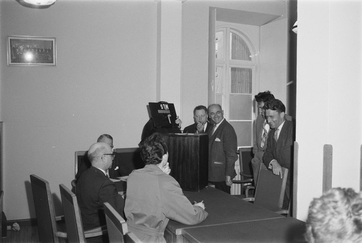 Myndin er tekin í Alþýðuhúsinu 2. júní 1961, þergar talin voru atkvæði um miðlunartillögu sáttasemjara. Vinnumálasambandið samþykkti þá tillögu en Vinnuveitendasambandið hafnaði henni.