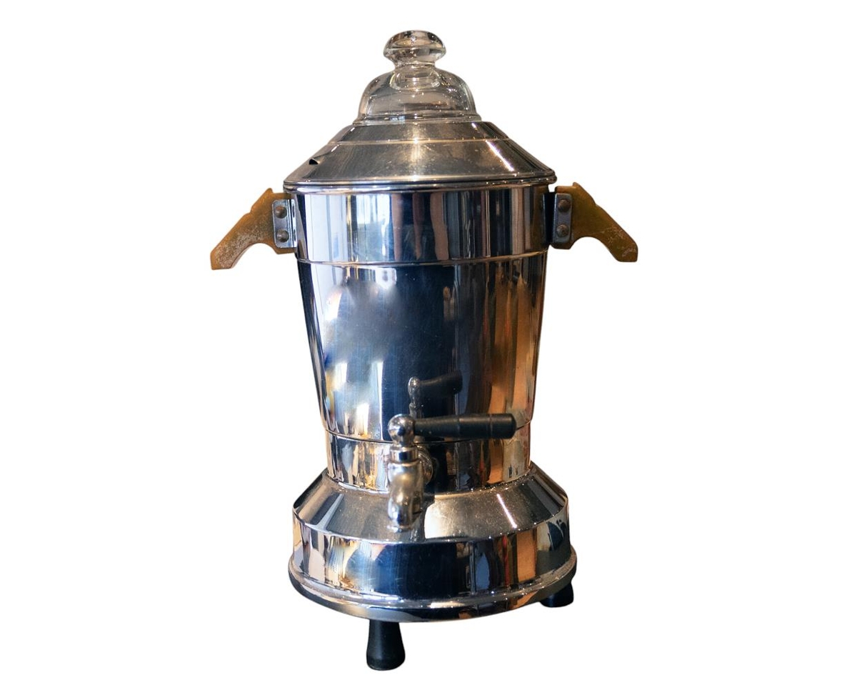 Upphá krómuð kaffivél með loki, á lokinu er glertoppur. Á belgnum neðarlega er krani, einnig er rör og kaffisigtið fylgja.