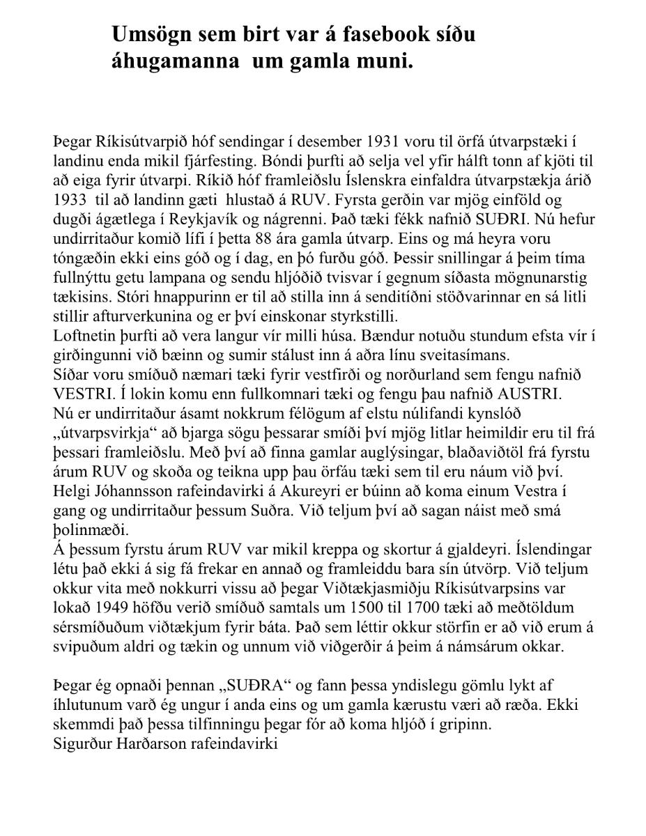 Suðri er fyrsta gerð útvarpstækis sem Viðtækjasmiðja Ríkisútvarpsins framleiddi fyrir almenna notkun. Framleiðsla á Íslenskum útvarpstækjum hófst 1933 þegar Viðtækjasmiðja var sett á laggirnar í tengslum við viðgerðaverkstæði sem Ríkisútvarpið stofnaði til að þjónusta neytendur eftir að útsendingar útvarps hófust frá Vatnsendahæð á Langbylgju 1930. Hönnun tækjanna var einföld til að ná niður framleiðslukostnaði og gera sem flestum kleift að eignast útvarp, því erlend tæki kostuðu allt að þriggja mánaða launum verkamanns. Aðeins var gert ráð fyrir að tækin næðu sendingum frá Ríkisútvarpinu. Fyrstu gerðir „Suðra“ voru aðeins með tveim lömpum, en síðar með þrem eins og þetta tæki sem er í Skógasafni.
